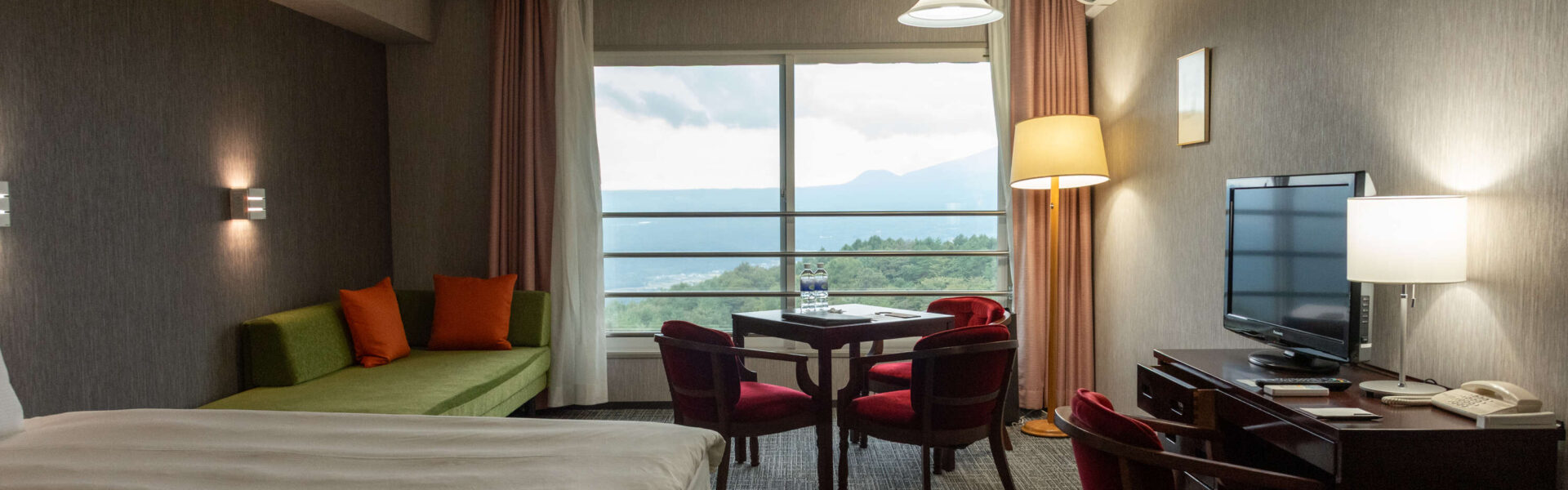 今回宿泊したのはスーペリアツインルーム。浅間山を望むツインルームで、客室は38.7㎡の広くゆとりのあるでデザインになっています。ベッドは2つ、ソファーベッドも1台あり最大3人まで宿泊することが可能。リビング部分には3脚の椅子のあるテーブルも用意されており、のんびりするための部屋として必要なものを備えています。