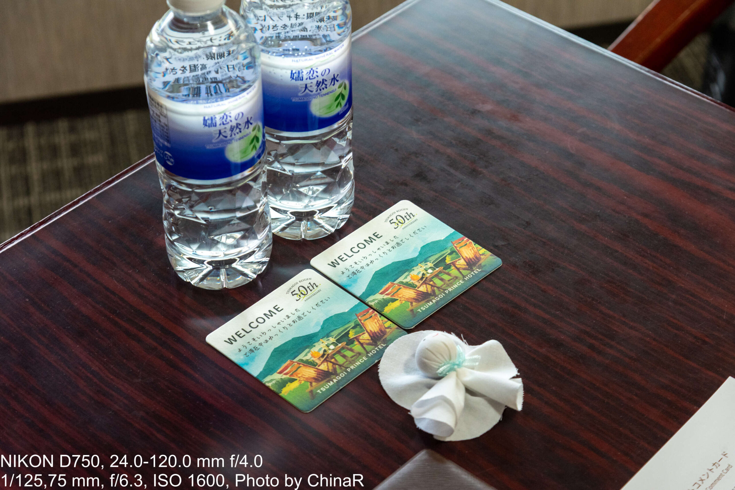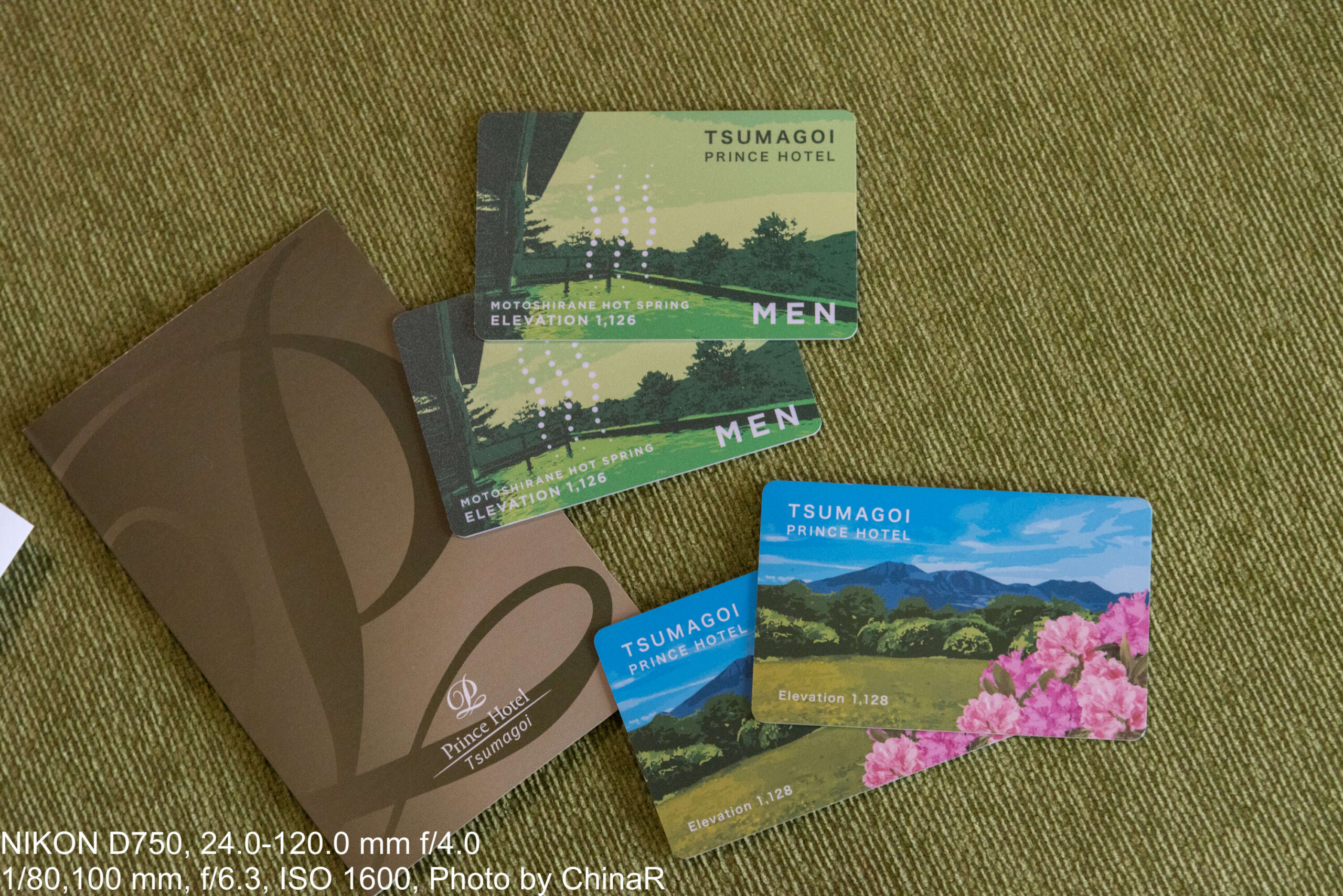 宿泊時には水も2つ用意。またリゾート地のプリンスホテルでおなじみのてるてる坊主も机の上に置いてありました。2025年は嬬恋プリンスホテルのもととなった嬬恋高原ゴルフ場の開業から50周年ということもあり、50周年を記念したコースターも。2024年末からのリニューアル時にカードキーも新調したようで、嬬恋の自然をデザインしたカードキーになっていました。温泉に関しては専用のカードキーを利用するようで、チェックイン時に2種類のカードキーを渡されます。