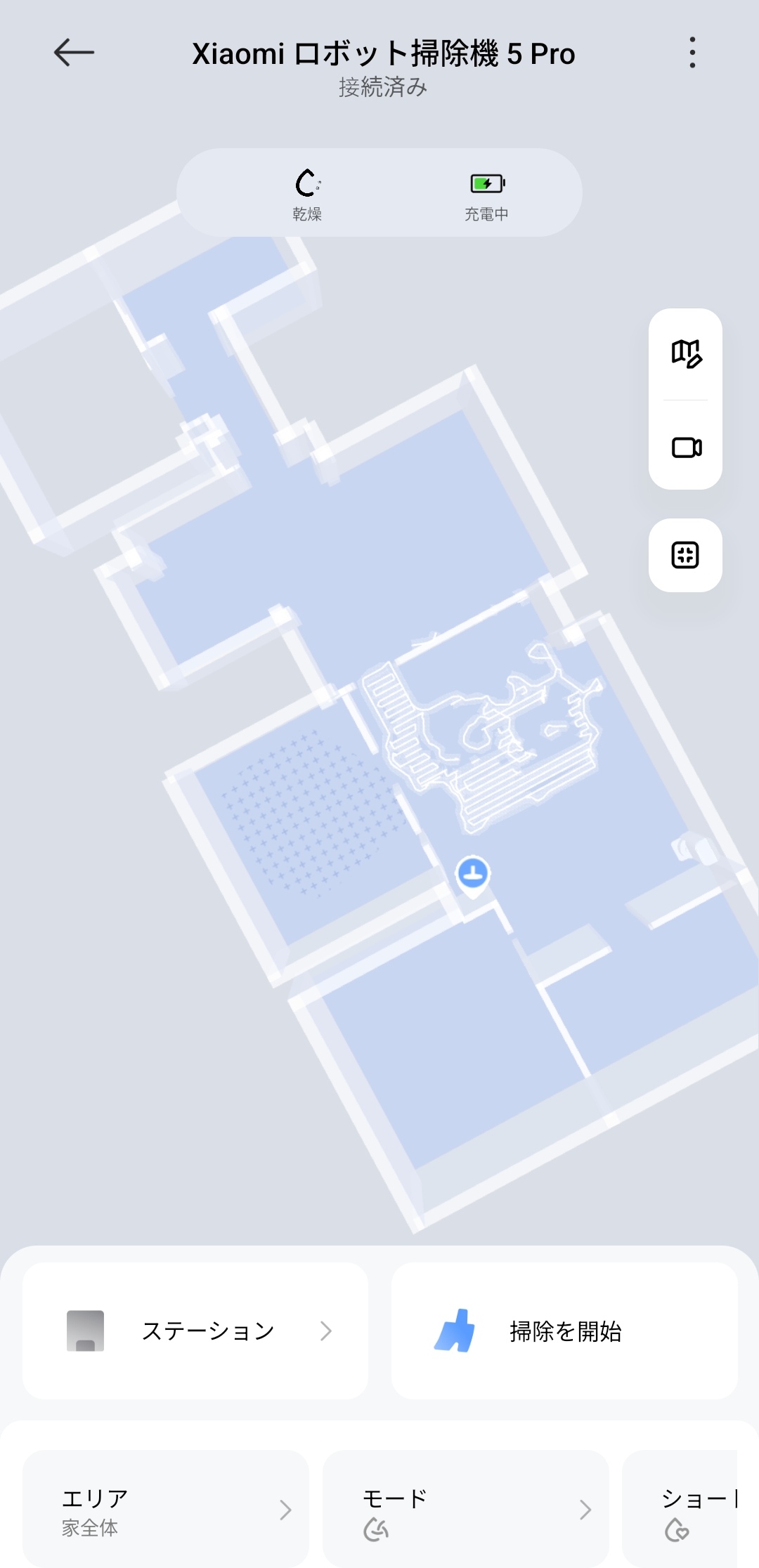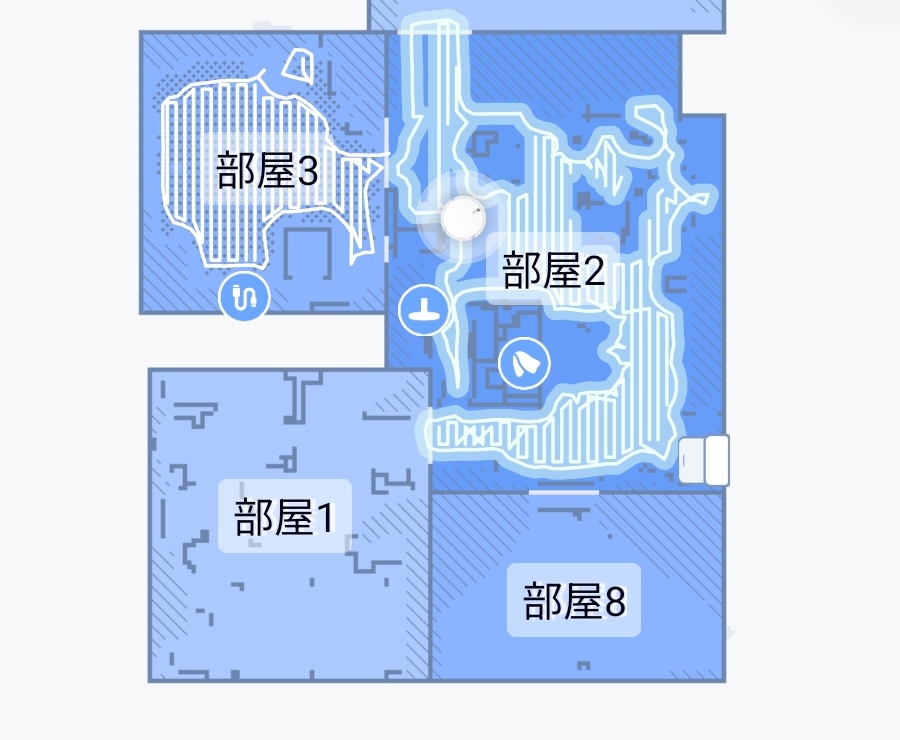 家具などが置かれていてアクセスができない部分については、マップ上では斜線で表現。このため家具の先にある部屋の隅を目掛けてXiaomi ロボット掃除機 5 Proが家具に突撃する、というのはきちんと避けてくれます。掃除に関しては、アクセスできる範囲についてまず外側を掃除し、その後内側を掃除するという順番でした。
