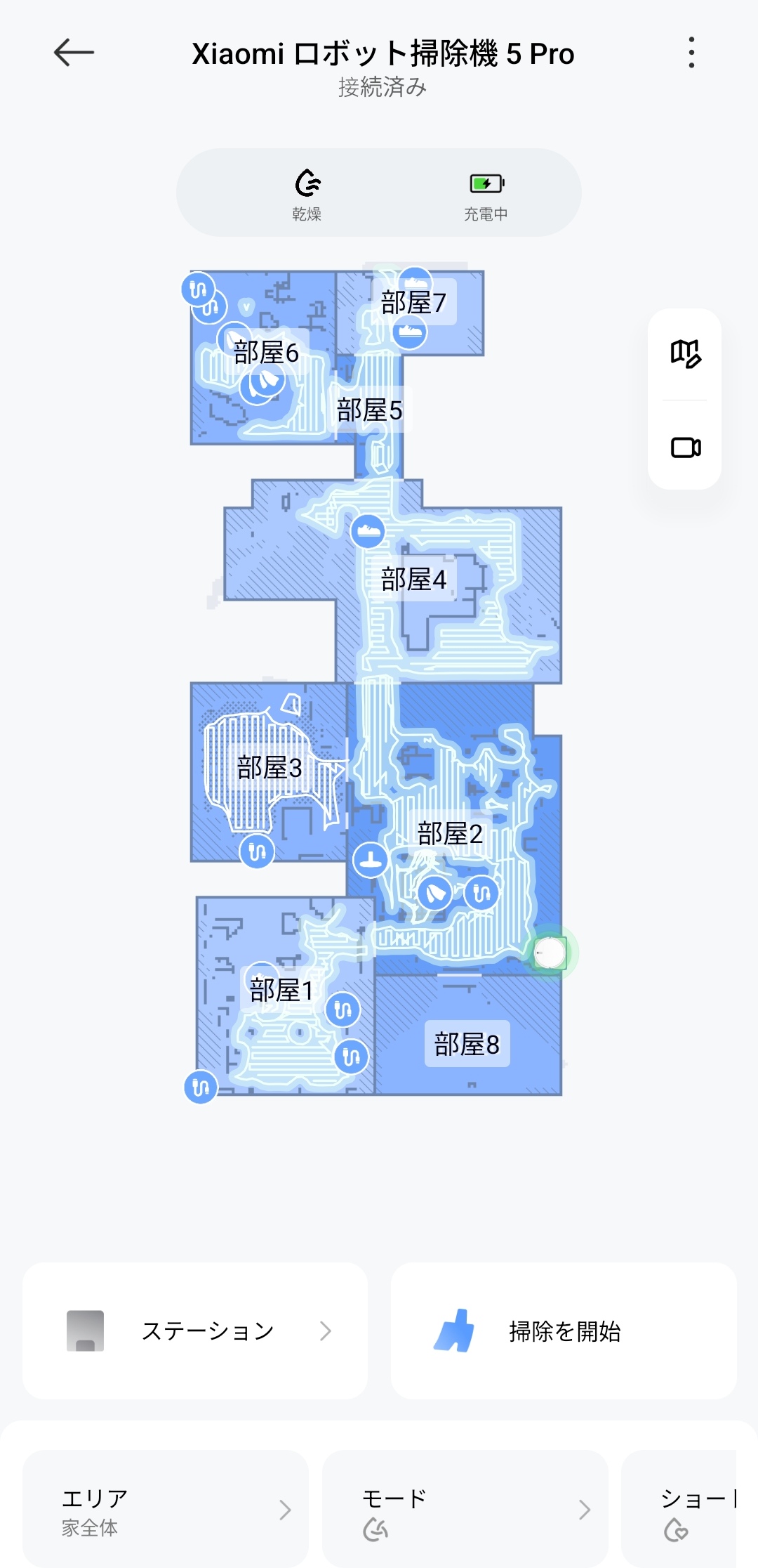 Xiaomi ロボット掃除機 5 Proの地図作成の特徴は、カメラとレーダーのデータを組み合わせることで部屋の構造を正確に把握しようとしていること。先日レビューしたDreame Aqua10 Ultra Rollerの場合は、棚や家具で覆われている部分は部屋の構造から除外されて、部屋の形状が凸凹な形でマッピングされていました。