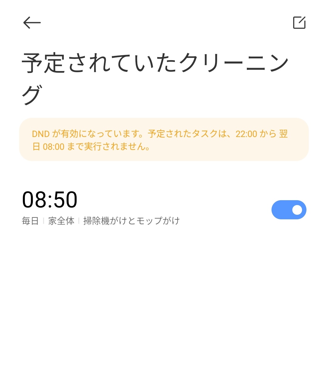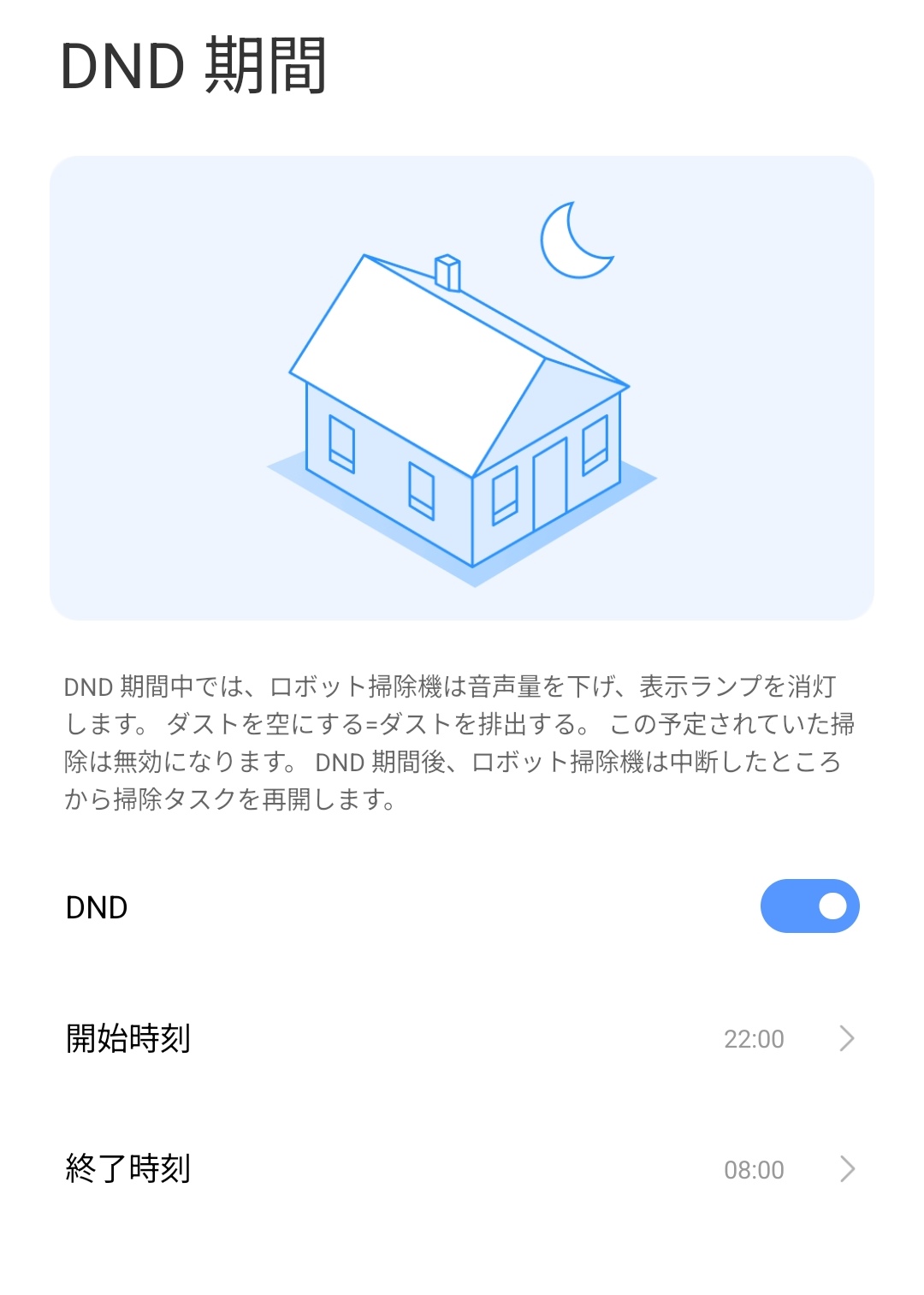 DND期間に関しては、本体から再生される音などを夜間帯は静音にするというもの。また、仮に掃除中だった場合にはこの時間の間は掃除を停止するようになっています。そもそもこんな時間に掃除を開始しないとは思いますが…