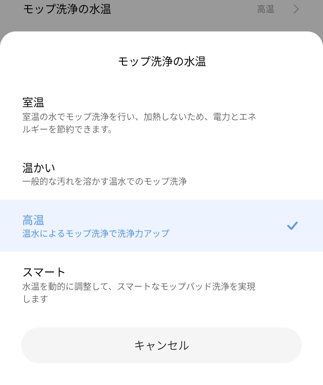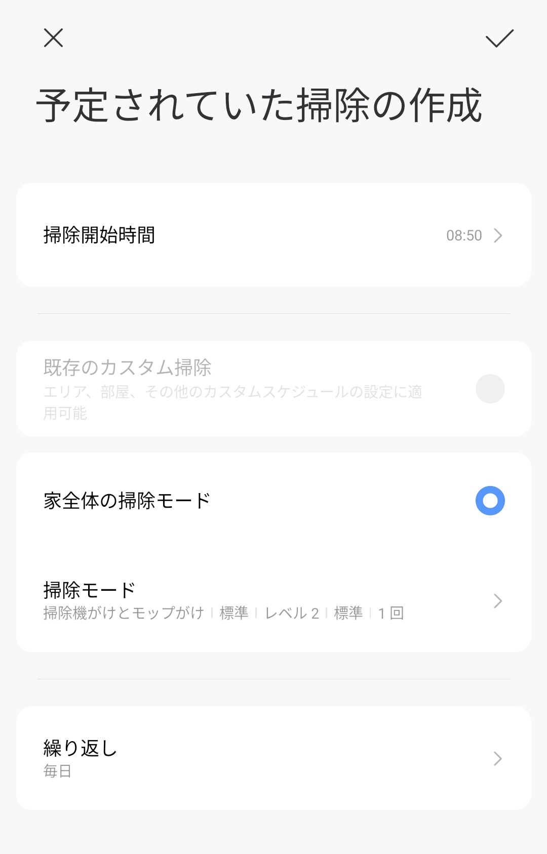 “予定されていたクリーニング”は、単純な掃除のスケジュール機能。毎日朝掃除をする、というような形で掃除の自動設定を行うことができるものです。私は手動でロボット掃除機をかけるほうが好みのためあまり利用しないものの、目覚まし代わりに朝掃除機を動かしたり、出勤していて絶対に家にいない間に掃除をさせる、という使い方ができるかと。掃除モードも切り替えられるため、週に1回はハード洗浄にする、という使い方も可能です。