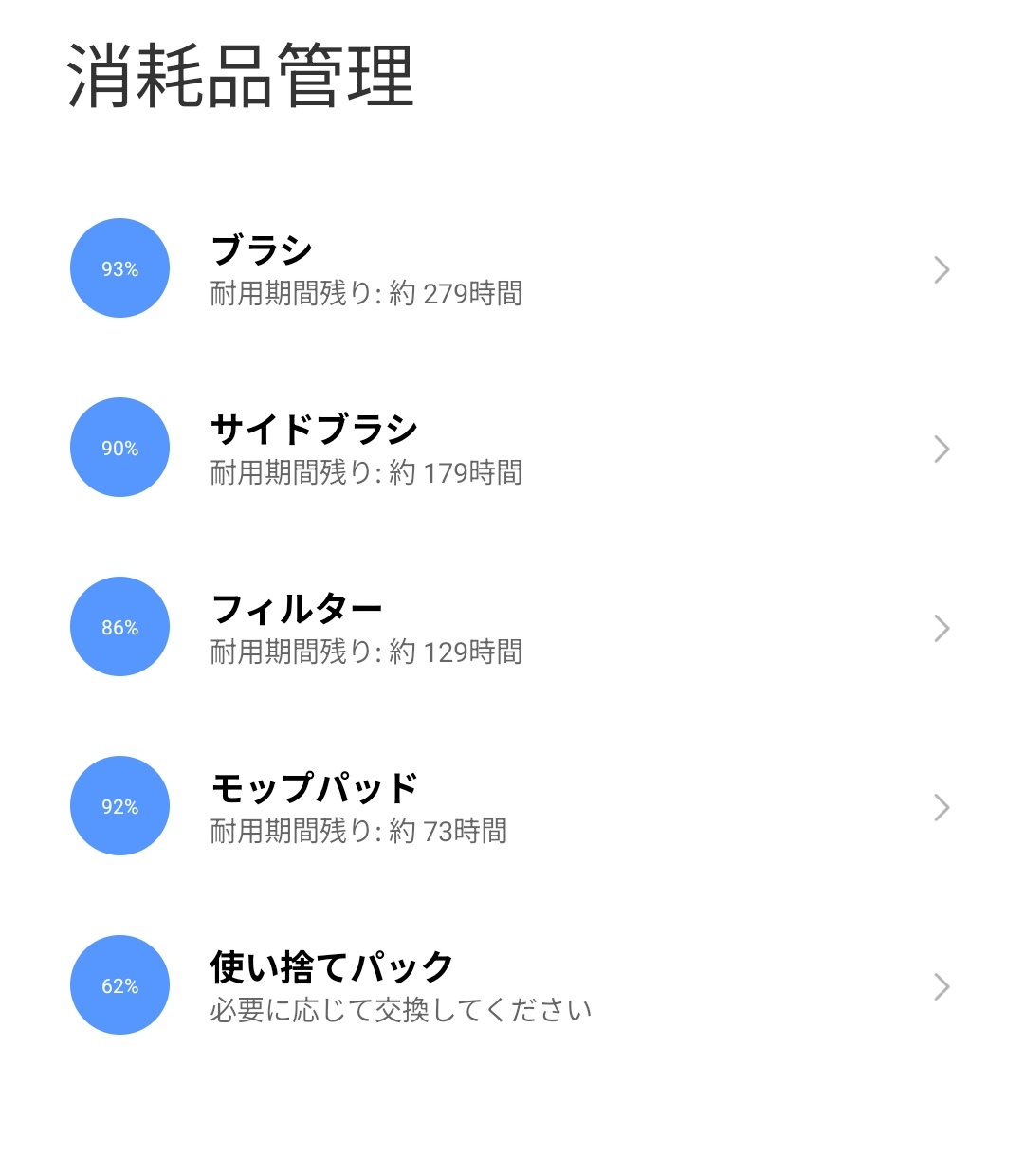 消耗品管理メニューではブラシやサイドブラシ、フィルターにモップパッドといった各種の消耗品の利用状況を表示。後どのくらいで交換のタイミングになるのか、というのをひと目で確認できるのでこちらもなかなか便利です。Xiaomiのロボット掃除機は、フィルターやブラシなどの消耗品を純正でも、互換品でも手頃な価格で購入できるためあらかじめまとめて買っておくと良さそうです。