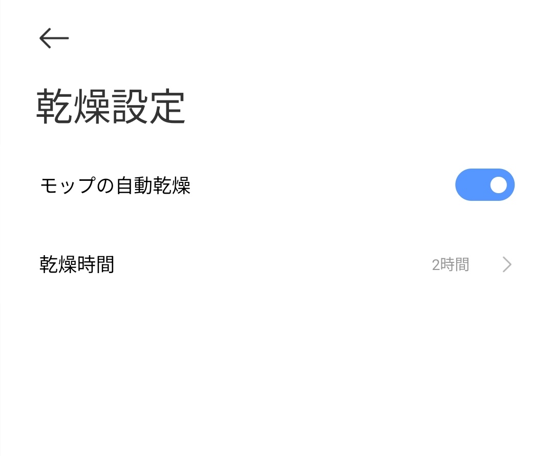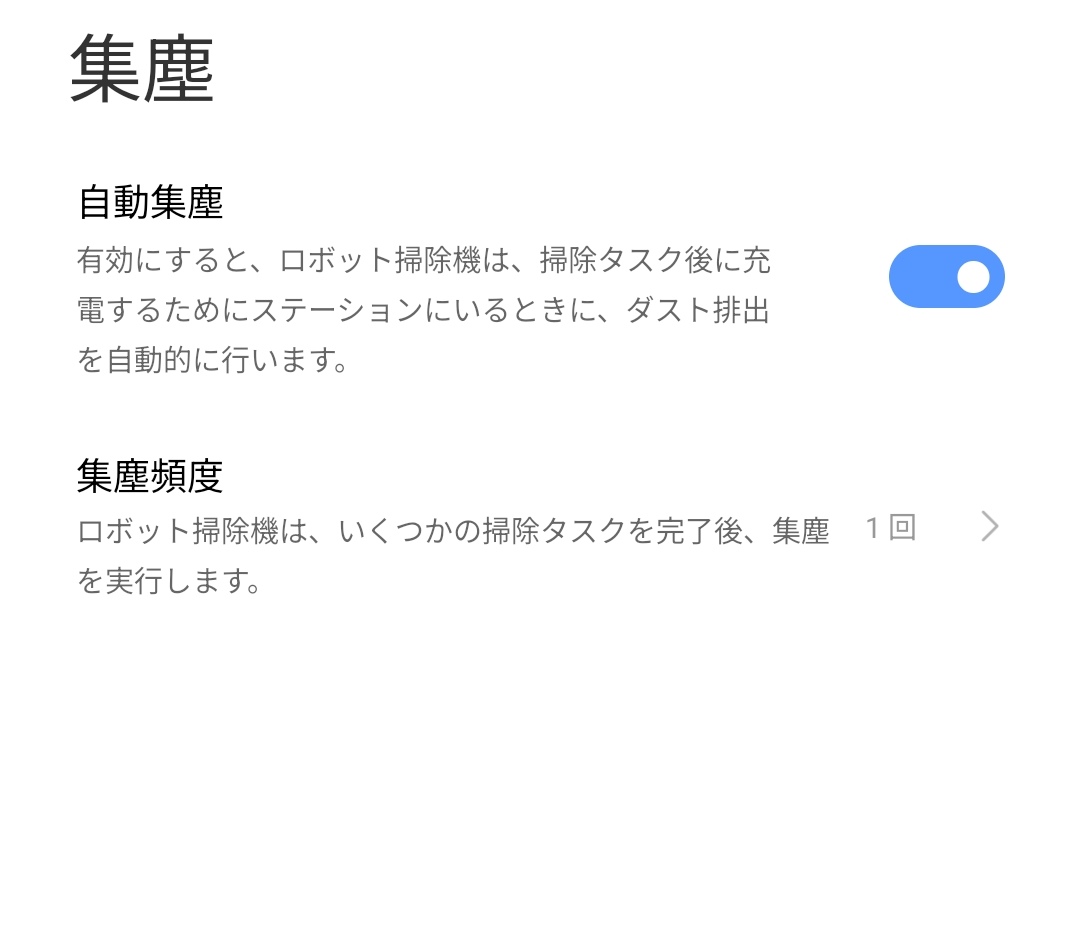 ロボット掃除機本体のダストボックスから、ステーションにゴミを収集する集塵の頻度についても設定が可能。この集塵の頻度はデフォルト設定で十分かと。一通りの掃除を終えたらゴミを回収してくれれば日常的に掃除機を動かしていれば困らないはずです。モップに関してはモップ自体の洗浄の頻度は前述したとおり。自動乾燥機能も利用でき、掃除完了後2時間、もしくはもっと長い時間乾燥させることが可能でした。