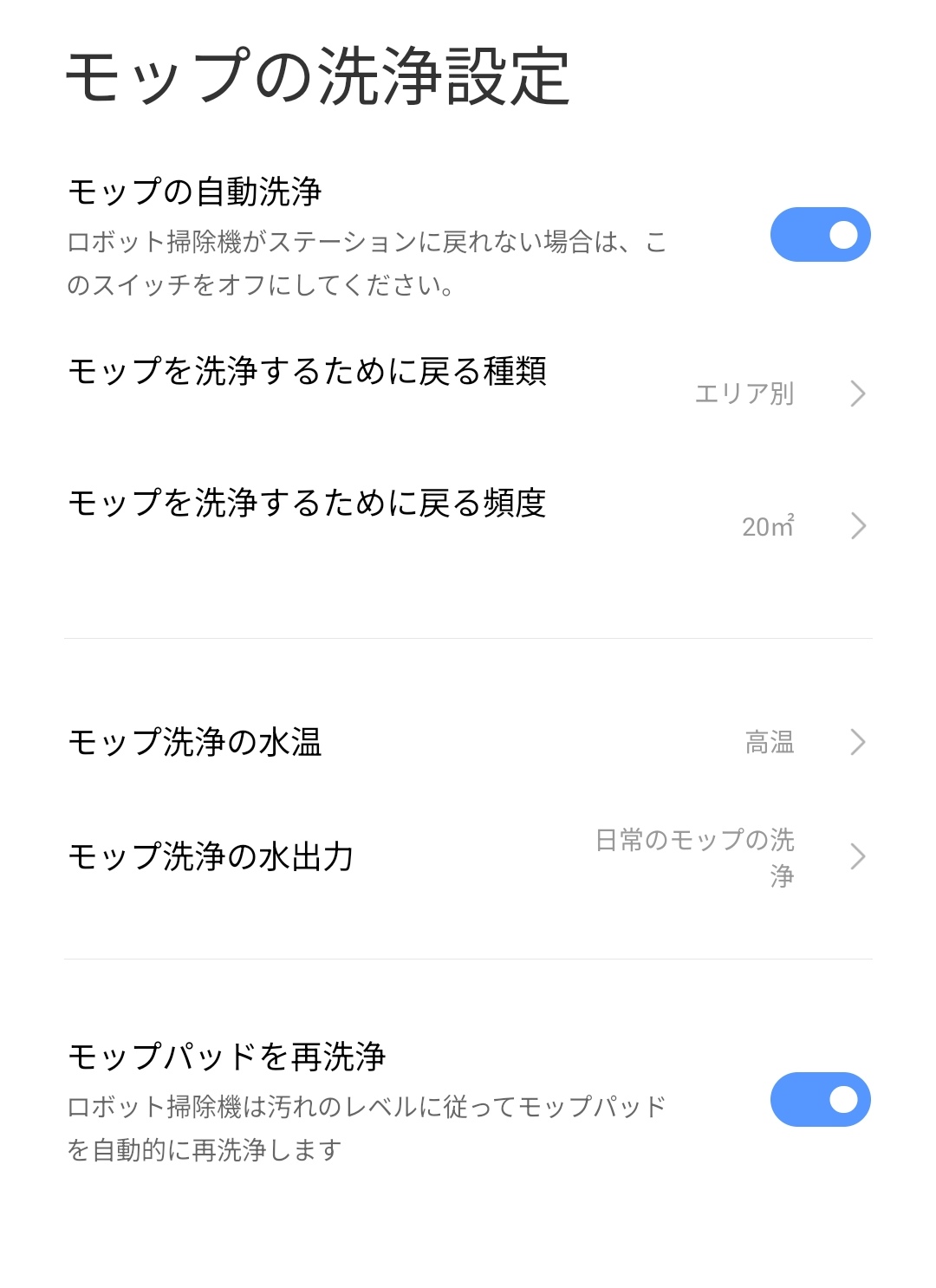 モップは床掃除中に他の場所の汚れを撒き散らさないように定期的に洗浄。この洗浄間隔はアプリ上から設定することが可能。マップ上で認識したエリア(部屋)が変わる度に洗浄するのはもちろんのこと、20㎡ごと(設定変更可能)にモップを洗浄することで常にきれいな状態でのモップがけが可能です。