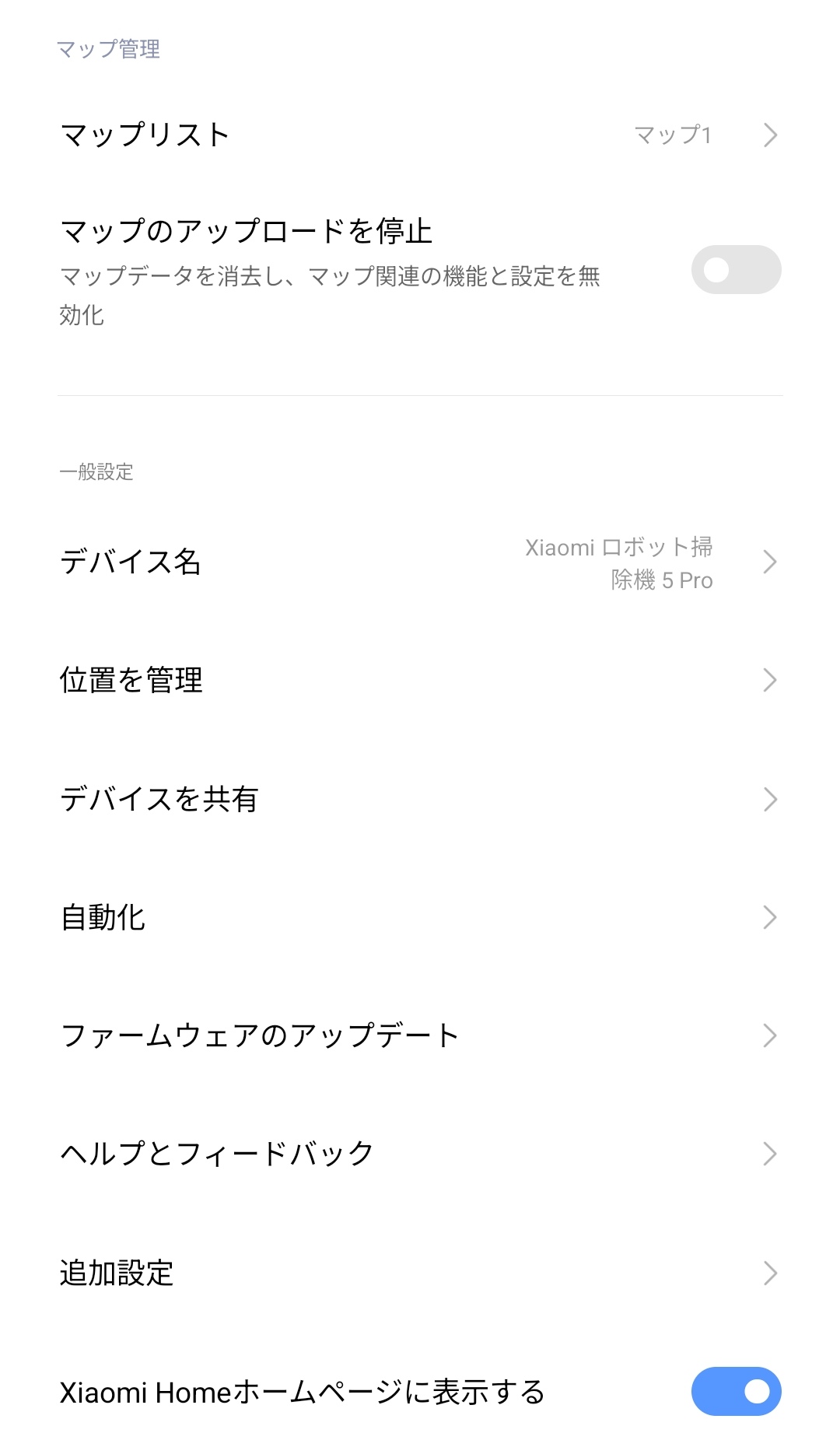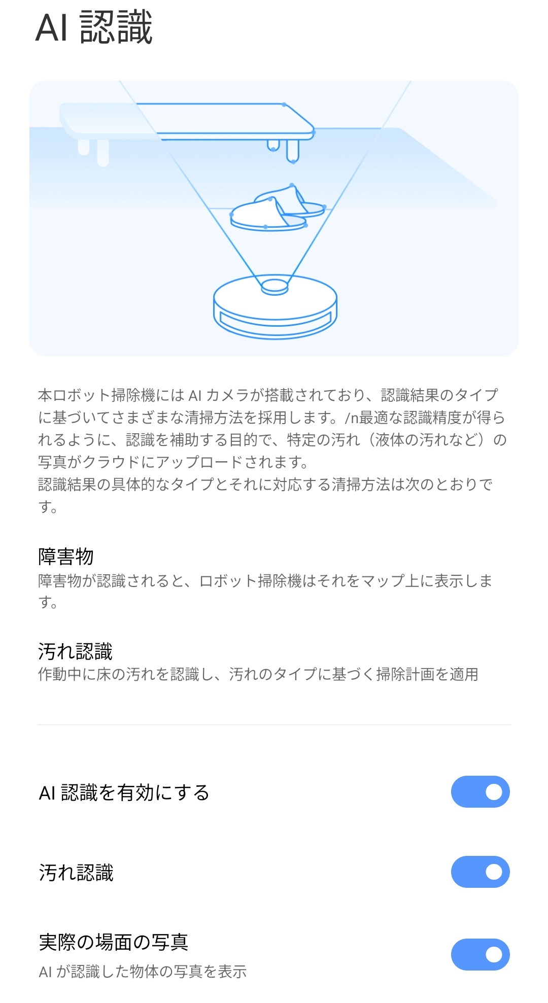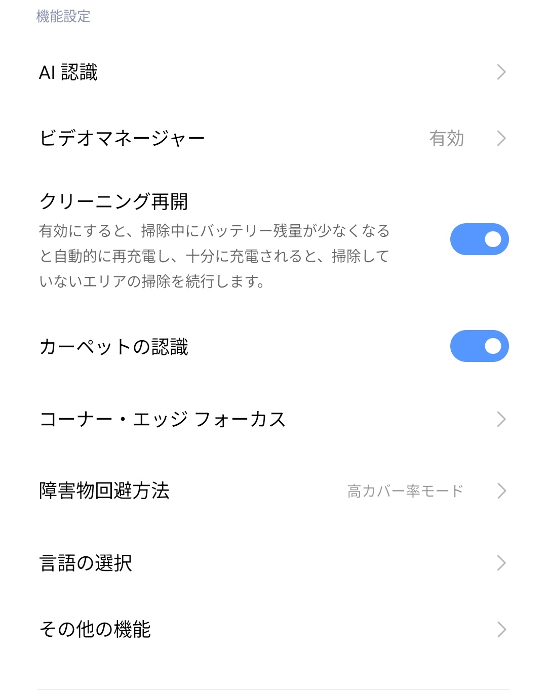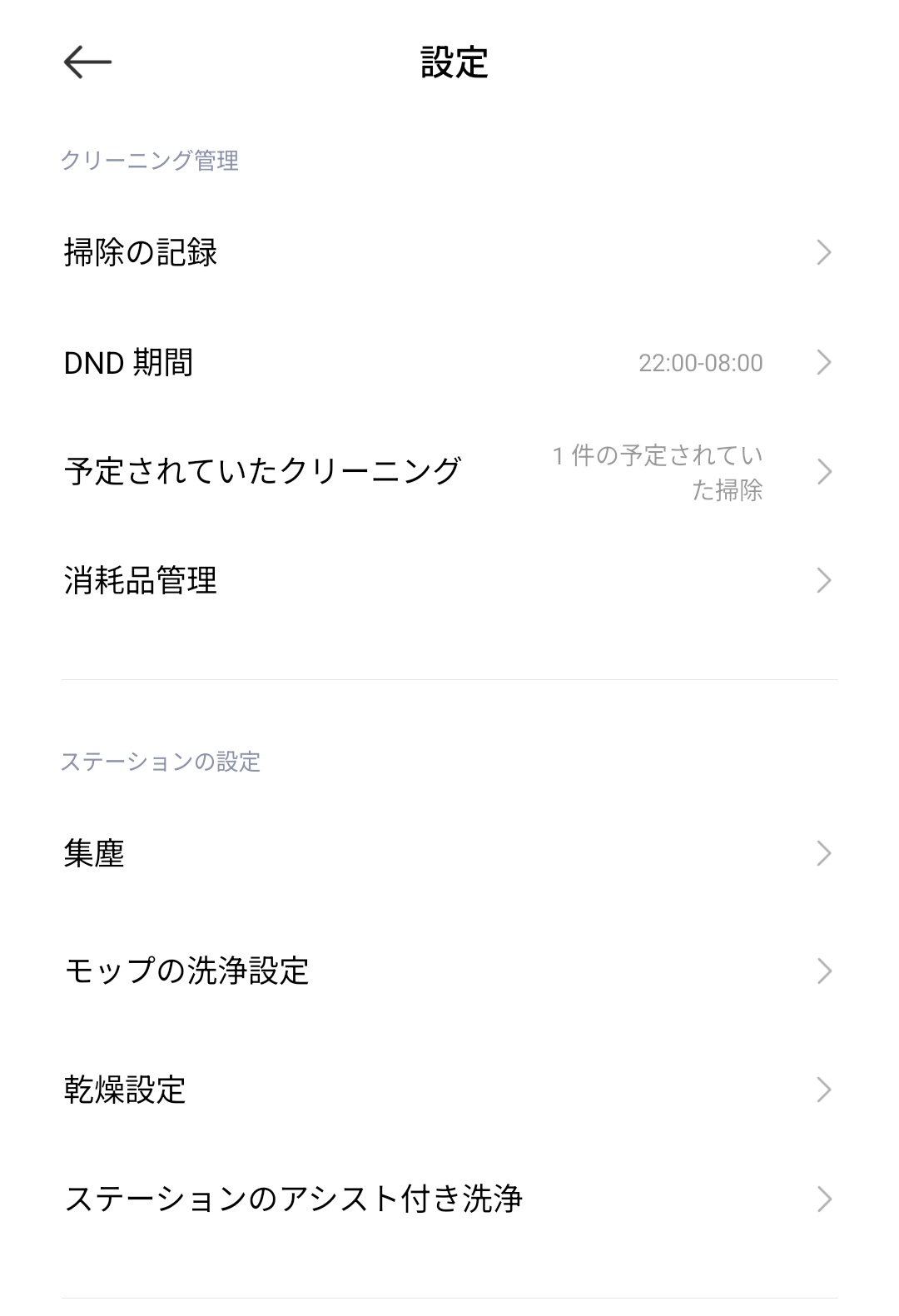 Xiaomi Homeアプリから設定画面にアクセスが可能。過去の掃除の履歴を参照できる掃除の記録メニューを始めとする掃除の時間や履歴の管理機能、ステーションの設定機能、そして本体のカメラの設定変更機能など設定項目は多岐にわたります。AI認識とビデオマネージャーについてはAIカメラに関する見出しで記載した通りでした。