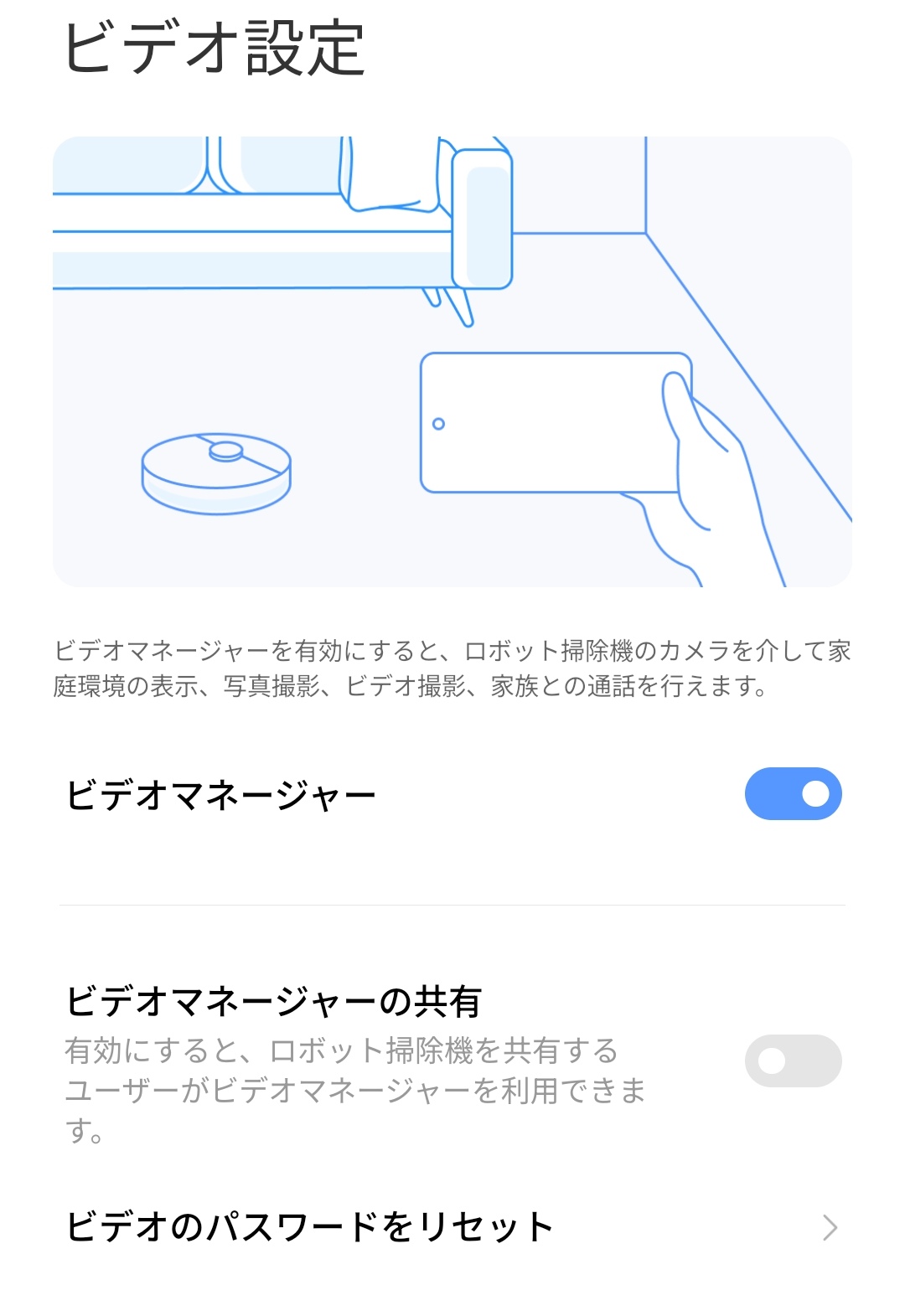 AIカメラ機能、ロボット掃除機のカメラを通じて家の様子を確認できる”ビデオマネージャー”機能については、設定画面から機能のON/OFFなどを設定が可能。本機を購入する方は基本的にこのAI機能を目当てにしているかと思うので、すべてONにしておくと良いかなと。ビデオマネージャーに関しては、パスワードを利用時に設定することになっており、万が一スマートフォンを落として第三者にアクセスされても、ロボット掃除機のカメラには無制限にはアクセスできないようになっています。