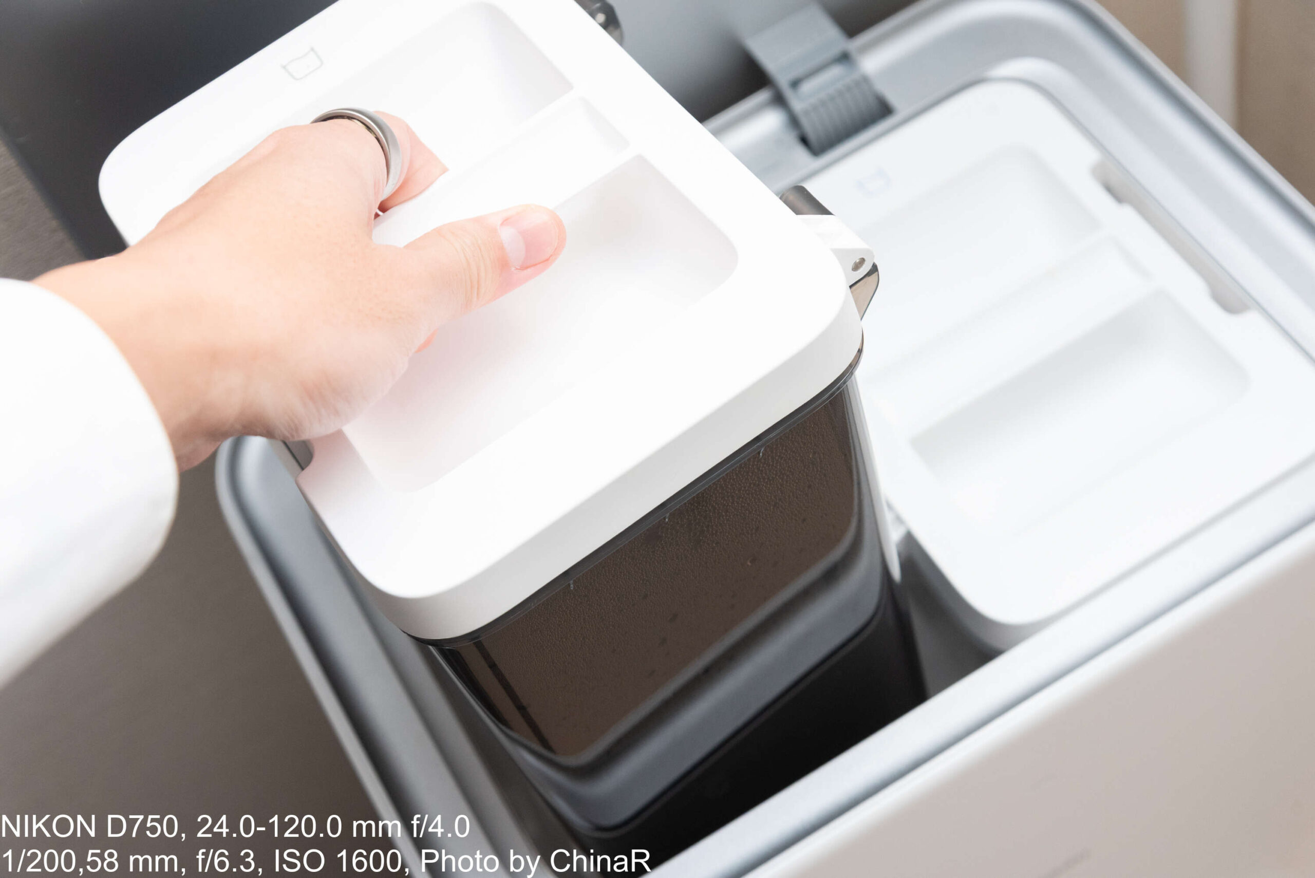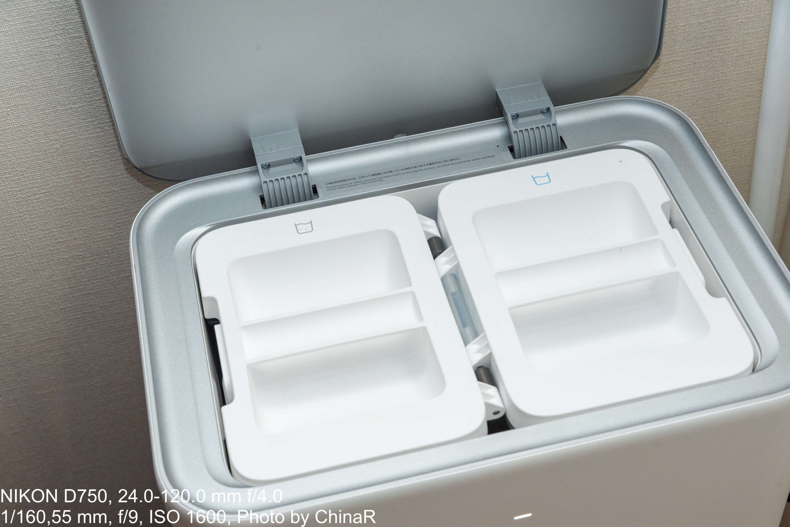 ベースステーションも本体と同じく白をメインとしたシンプルな色合い。リビングの白い壁と合わせても程よくマッチしてくれます。ステーションの蓋を開けると上に汚水タンクと静水タンクを配置。静水タンクの容量は4Lと大型で最大400㎡の水拭きに対応しています。