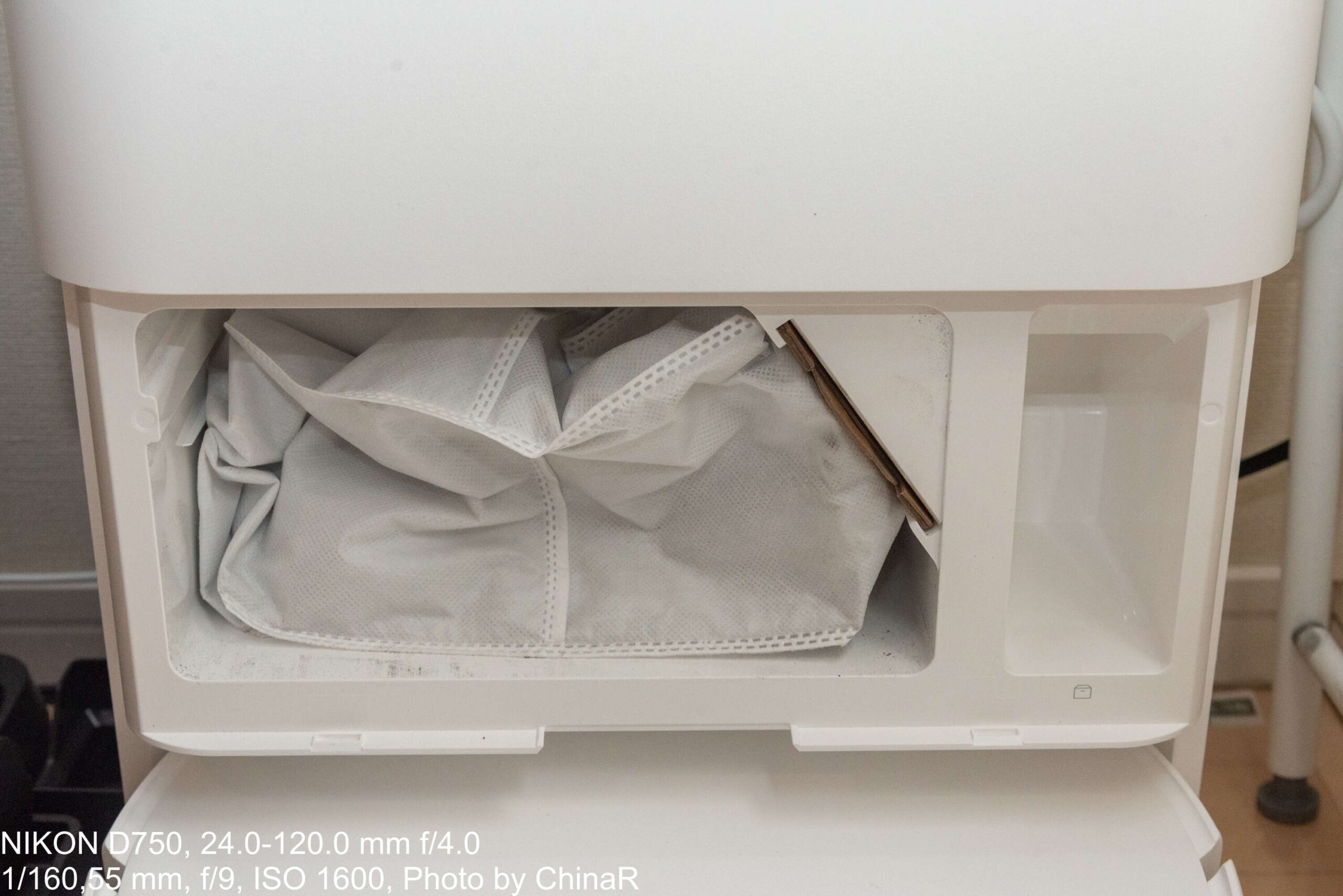 側面を開けると使い捨てのダストバッグも配置。本製品のダストバッグの容量は明記されていないものの約2.5Lのものと想定されます。公称の使用目安としては、3人家族+ペット1匹の120㎡の家で1日1回掃除した場合、最長75日間(約2.5~3ヶ月)交換不要とあり、紙パックを一度交換したら最低でも2ヶ月は使い続けられる計算に。この期間は嬉しいポイントと言えます。
