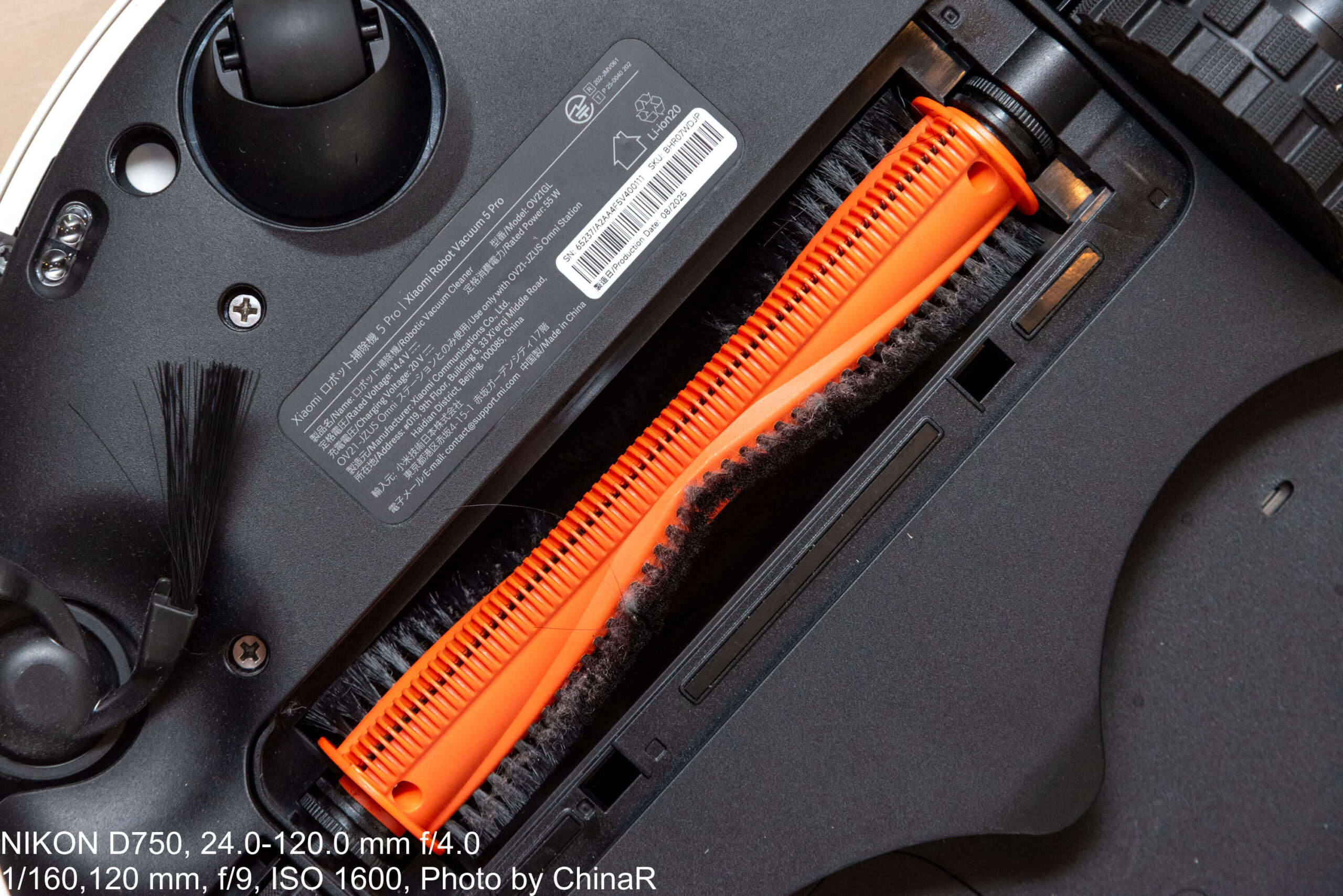 裏側を確認してみると、サイドブラシとオレンジ色が目立つメインブラシが確認可能。このメインブラシをよく見てみると、内側に刃のようなものが見て取れるかと。この部分はヘアカットブレードになっており2枚の刃で吸い込んだ髪の毛を切ってしまいます。これと大口径絡まり防止サイドブラシで髪の毛の除去率も99%と高い性能を実現しているんだとか。