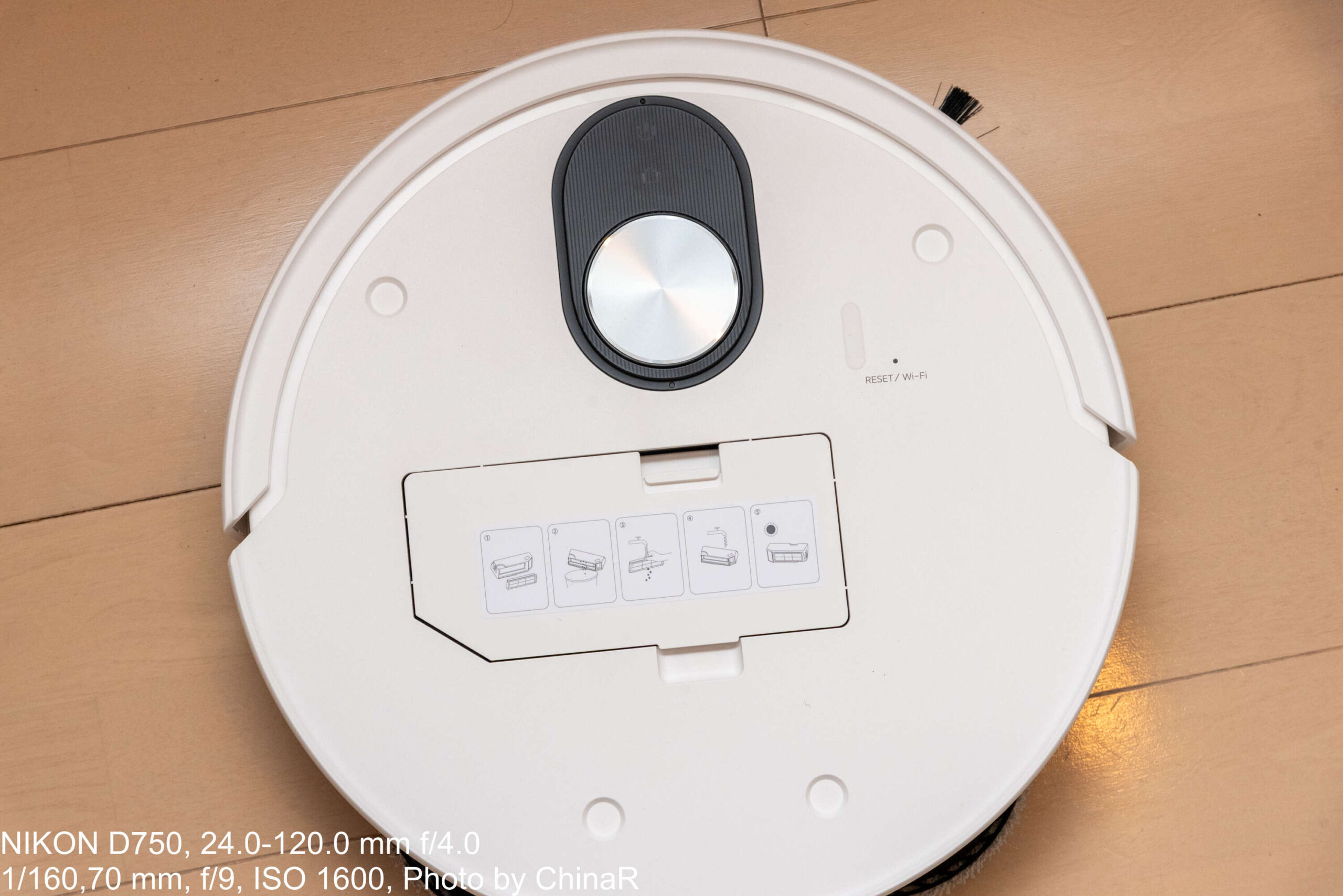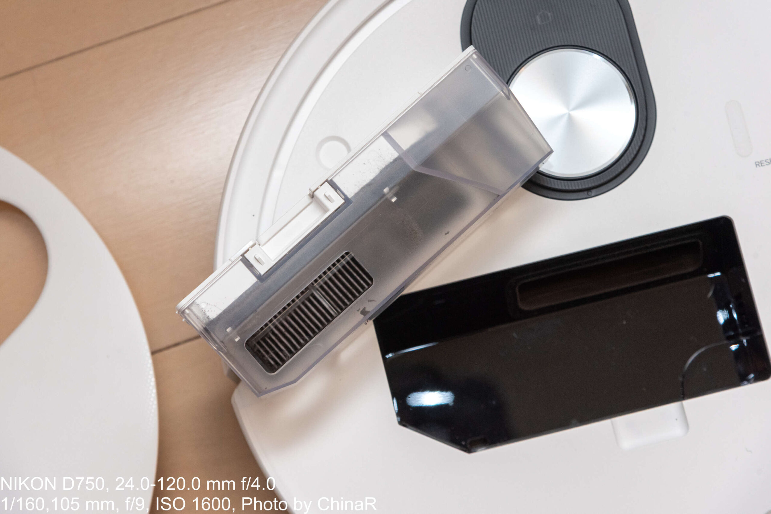 本体の上面のデザインは非常にシンプル。白一色のデザインで昇降式のdToFレーザー部分が黒色のアクセントになっています。外カバー部分を外すと本体のダストボックス部分にアクセス可能。基本的にゴミは自動的にベースステーションに収集されるものの、利用していると徐々に本体のフィルターが詰まったり、ダストボックスにもゴミが滞留しだすのでここからメンテナンスが可能です。