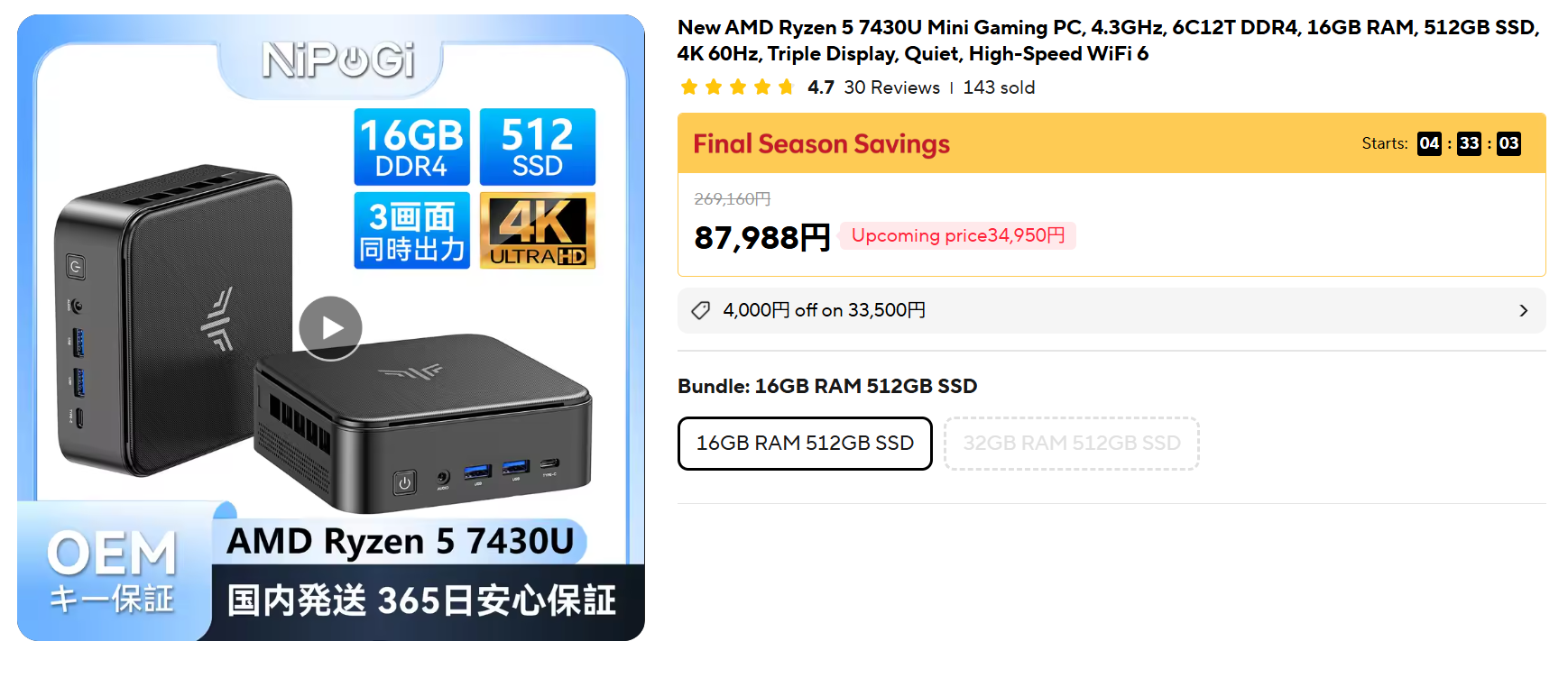 | NiPoGi ミニPC | Ryzen 5 7430U (6C/12T, 4.3GHz) | 16GB DDR4 | 512GB SSD | 4K/3画面/Wi-Fi 6 | 34,950円 | 購入 |