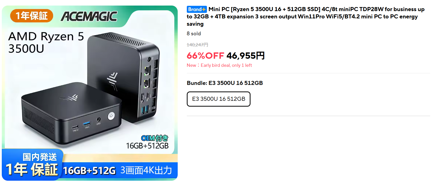 AceMagicのRyzen 5 3500U搭載・16GB+512GB SSD・省電力TDP28Wのビジネス向けミニPCが46,955円