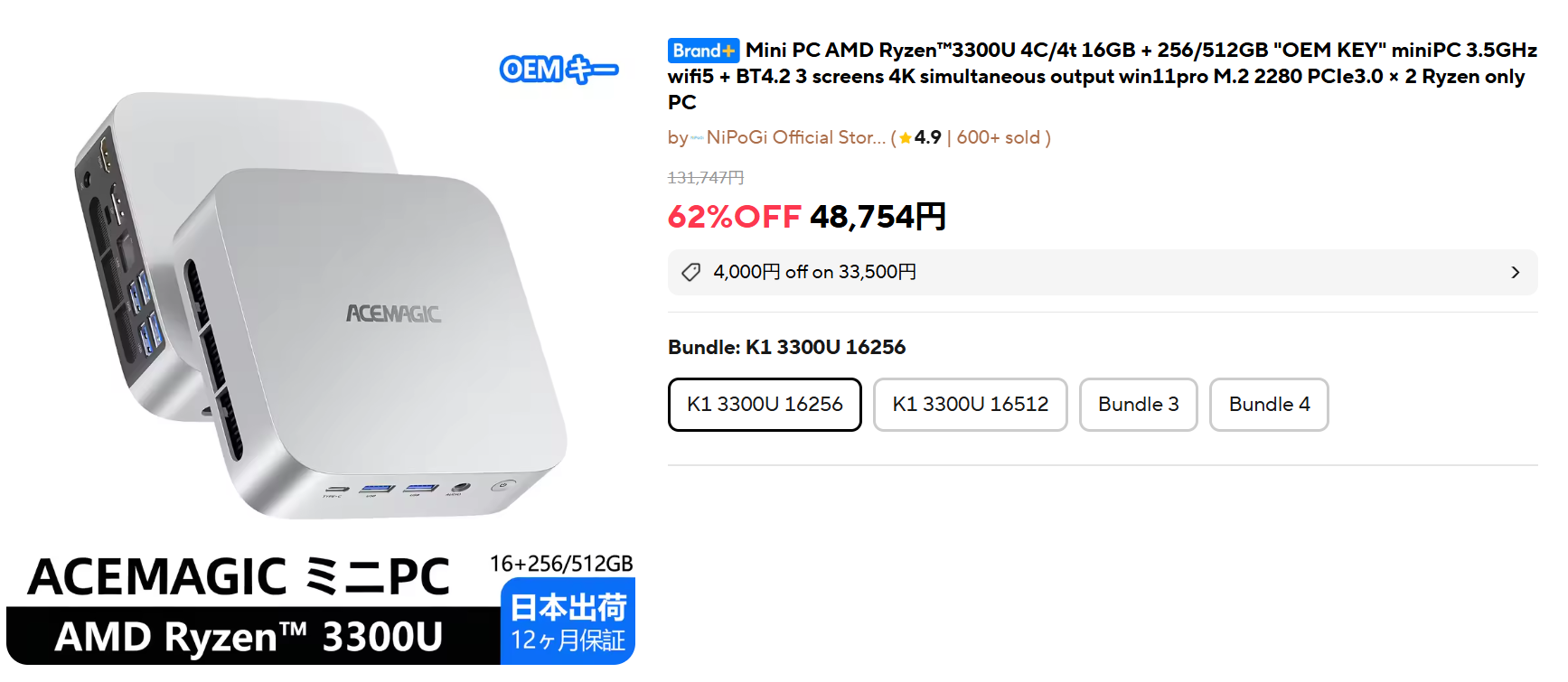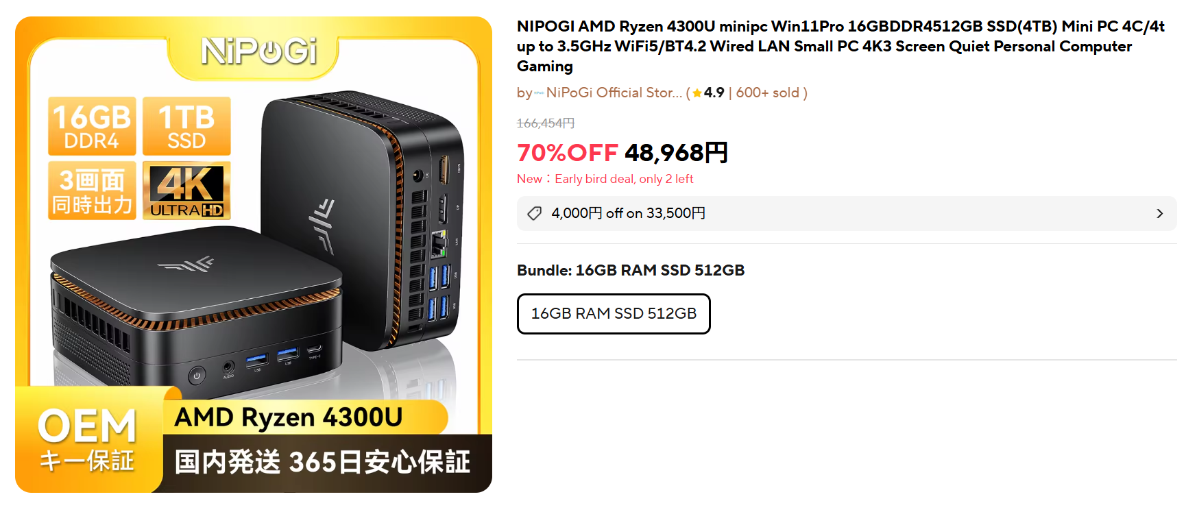 | NiPoGi ミニPC | Ryzen 3 4300U (4C/4T, 3.5GHz) | 16GB DDR4 | 512GB SSD | 4K/3画面/静音設計 | 47,214円 | 購入 |