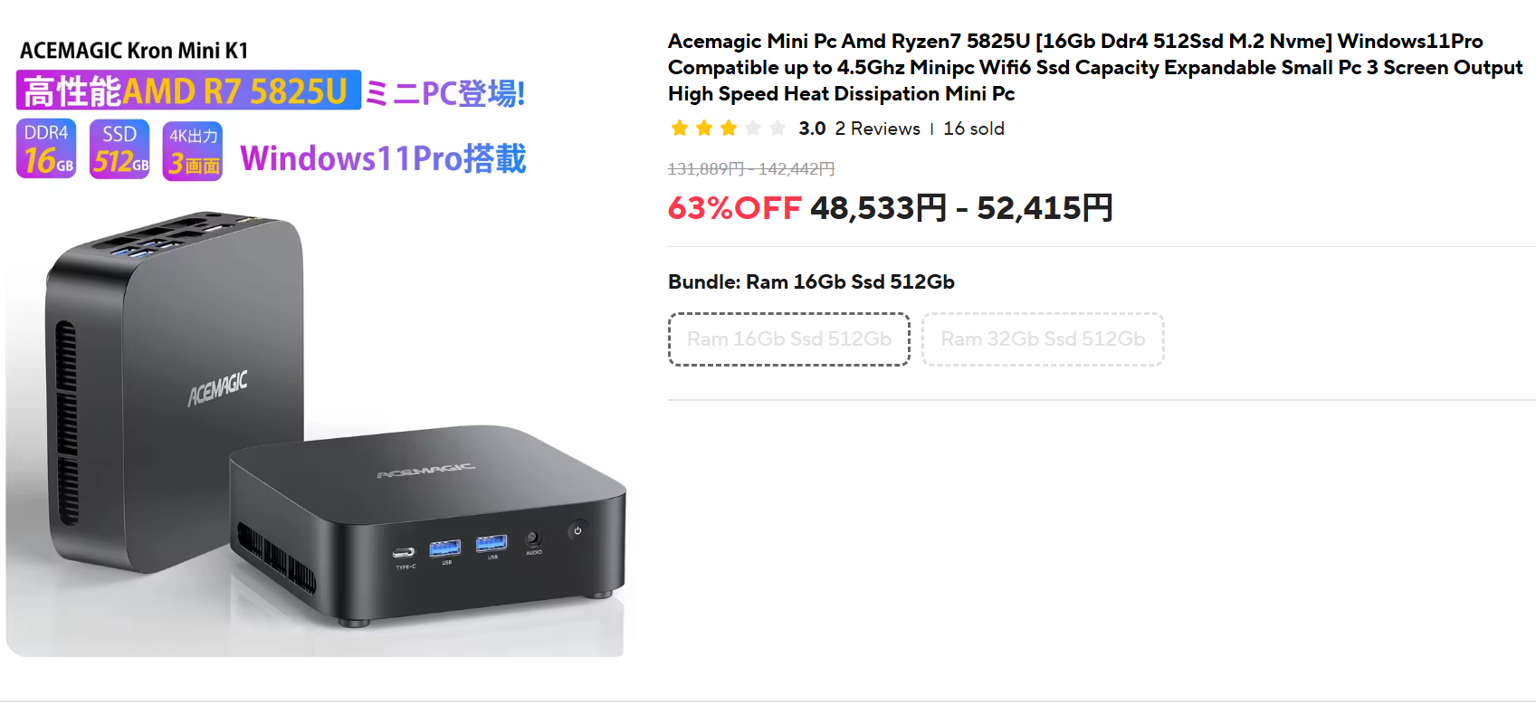 | AceMagic ミニPC | Ryzen 7 5825U (8C/16T, 4.5GHz) | 16GB DDR4 | 512GB NVMe | Win11Pro/Wi-Fi 6/拡張可能 | 48,533円 | 購入 |