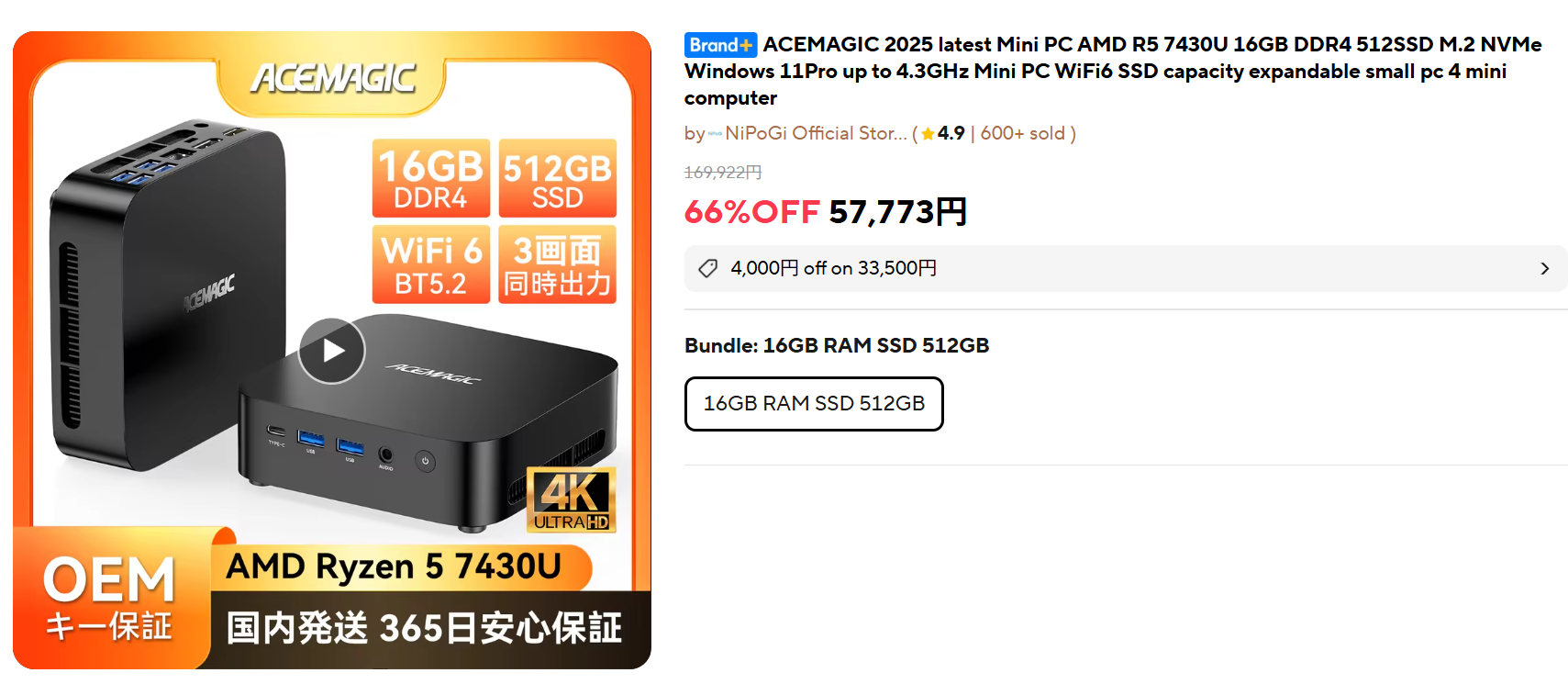 通常価格169,922円のところ、セール価格は57,773円と66%オフ、さらに33,500円以上の購入で4,000円オフのクーポンも利用可能です。NiPoGi公式ストアからの出品で、4.9の高評価と600件以上の販売実績が信頼性を裏付けています。最新のWi-Fi 6規格による高速無線接続を求める方、将来的なストレージ拡張を見据えて柔軟性の高いシステムを構築したい方、4画面構成でのマルチタスク環境を実現したい方に最適です。