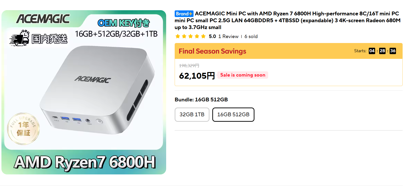 AceMagicのRyzen 7 6800H搭載・16GB LPDDR5・512GB SSD・Radeon 680M搭載ミニPCが62,105円
