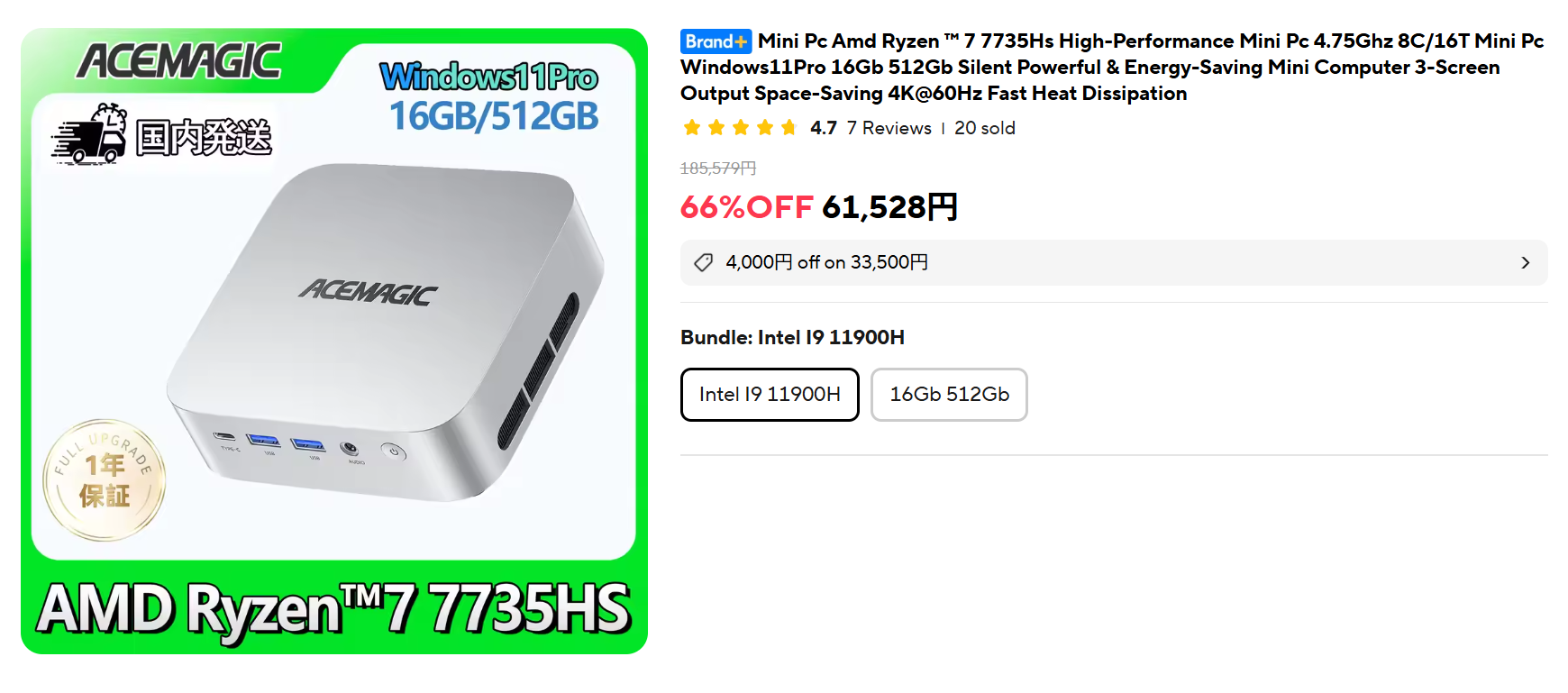 AceMagicのRyzen 7 7735HS搭載・最大4.75GHz動作・省電力設計ミニPCが63,585円