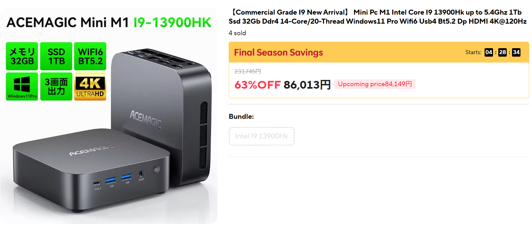 通常価格233,745円に対して、セール開始後の予定価格は84,149円と63%オフ。商業グレードの品質基準で製造、NiPoGi公式ストアの高い評価と豊富な販売実績が信頼性を裏付けています。動画編集やゲーム配信、3Dレンダリングなど高負荷な作業を日常的に行う方、4K高リフレッシュレートでのゲーミング環境を構築したい方に最適なハイエンドモデルです。