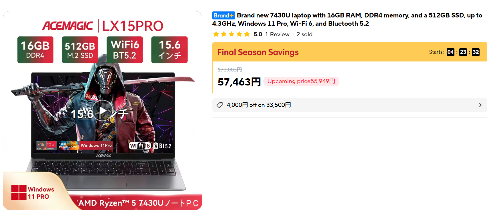 通常価格247,911円に対して、セール価格は82,200円と66%オフ。3件のレビューで5.0の満点評価を獲得、11台の販売実績があります。Ryzen 7 7730Uの高い処理性能とWi-Fi 6の低遅延接続でゲーミング用途はもちろん、動画配信やコンテンツ制作など幅広い用途に対応可能。コンパクトなゲーミング環境を構築したい方、高性能と省スペースを両立させたい方におすすめのモデルです。