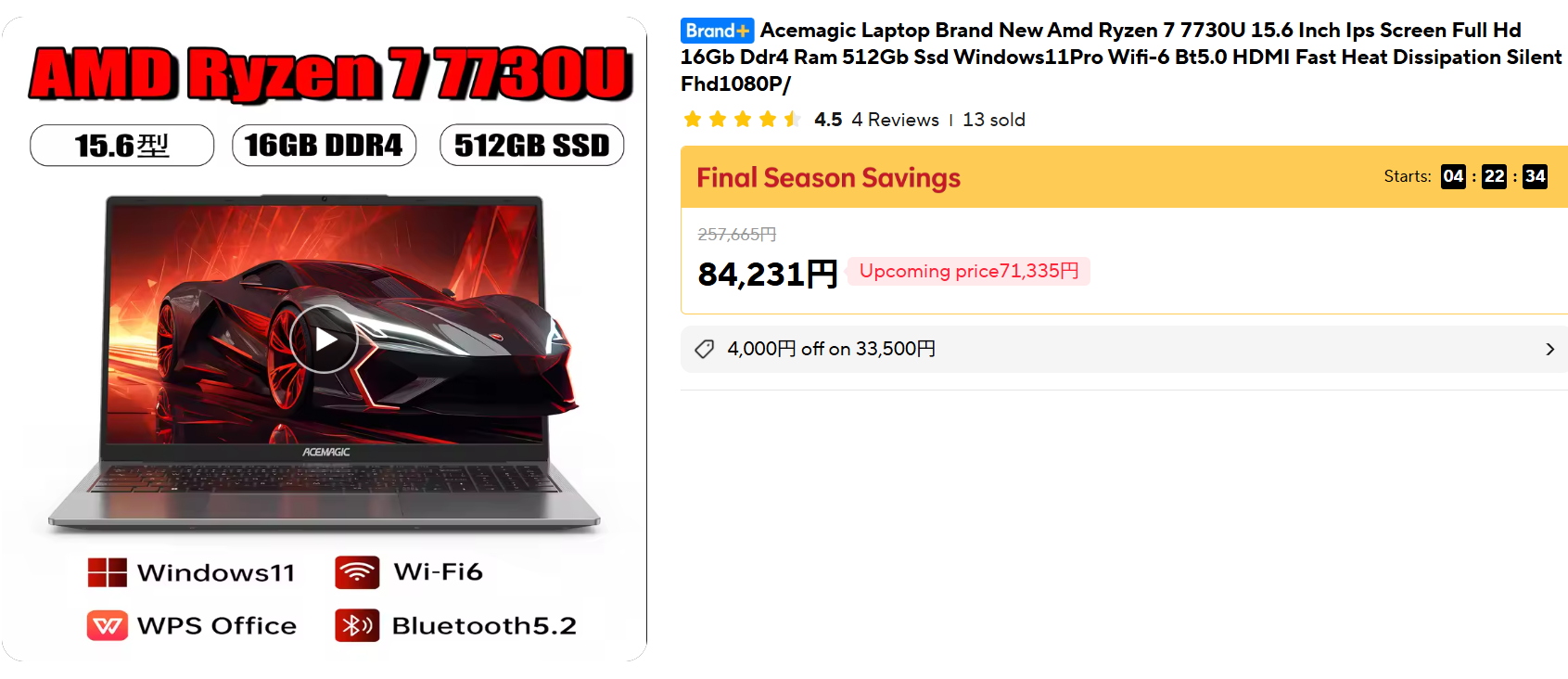 | AceMagic ノートPC 15.6インチ | Ryzen 7 7730U (8C/16T) | 16GB DDR4 | 512GB SSD | FHD IPS/Wi-Fi 6/静音設計 | 71,335円 | 購入 |