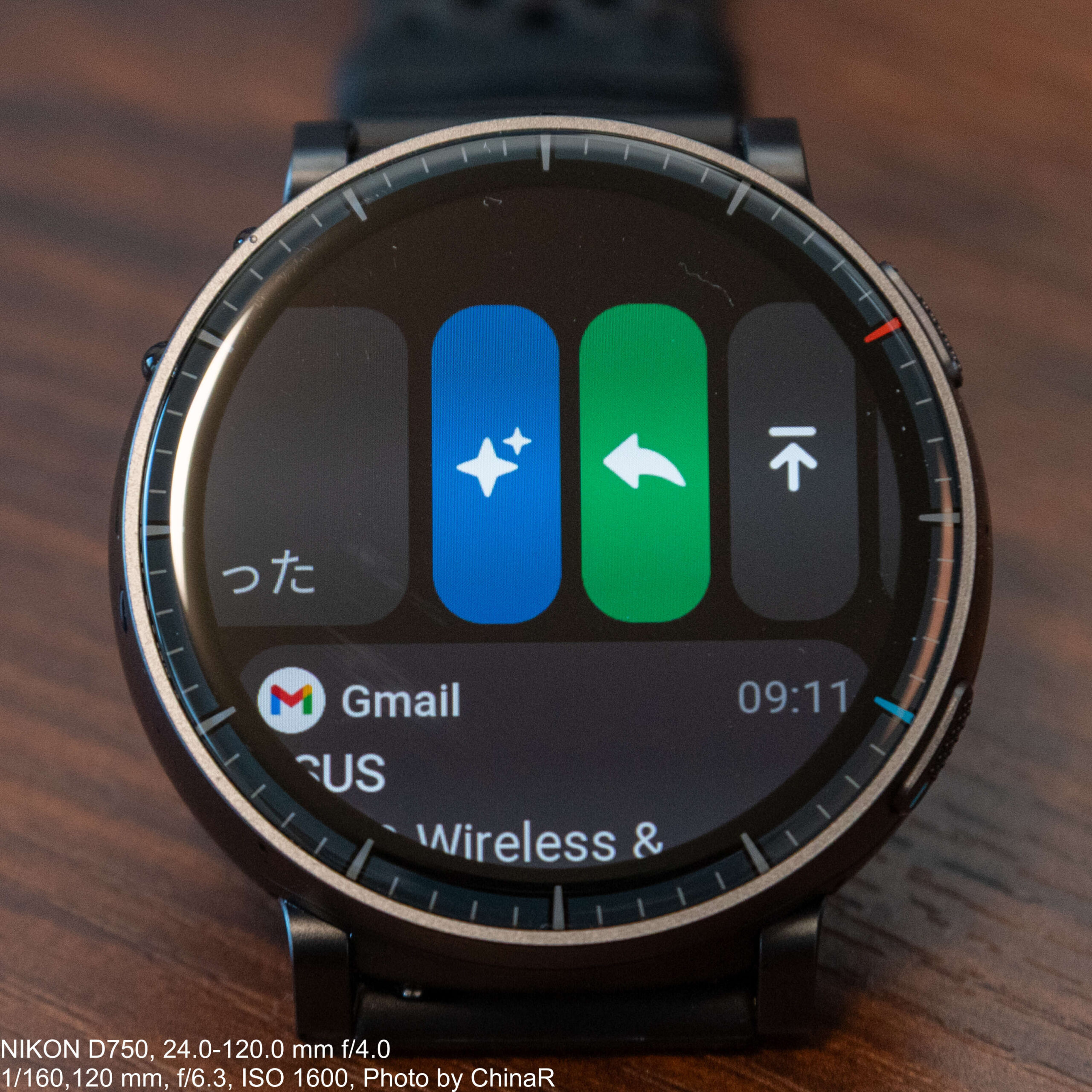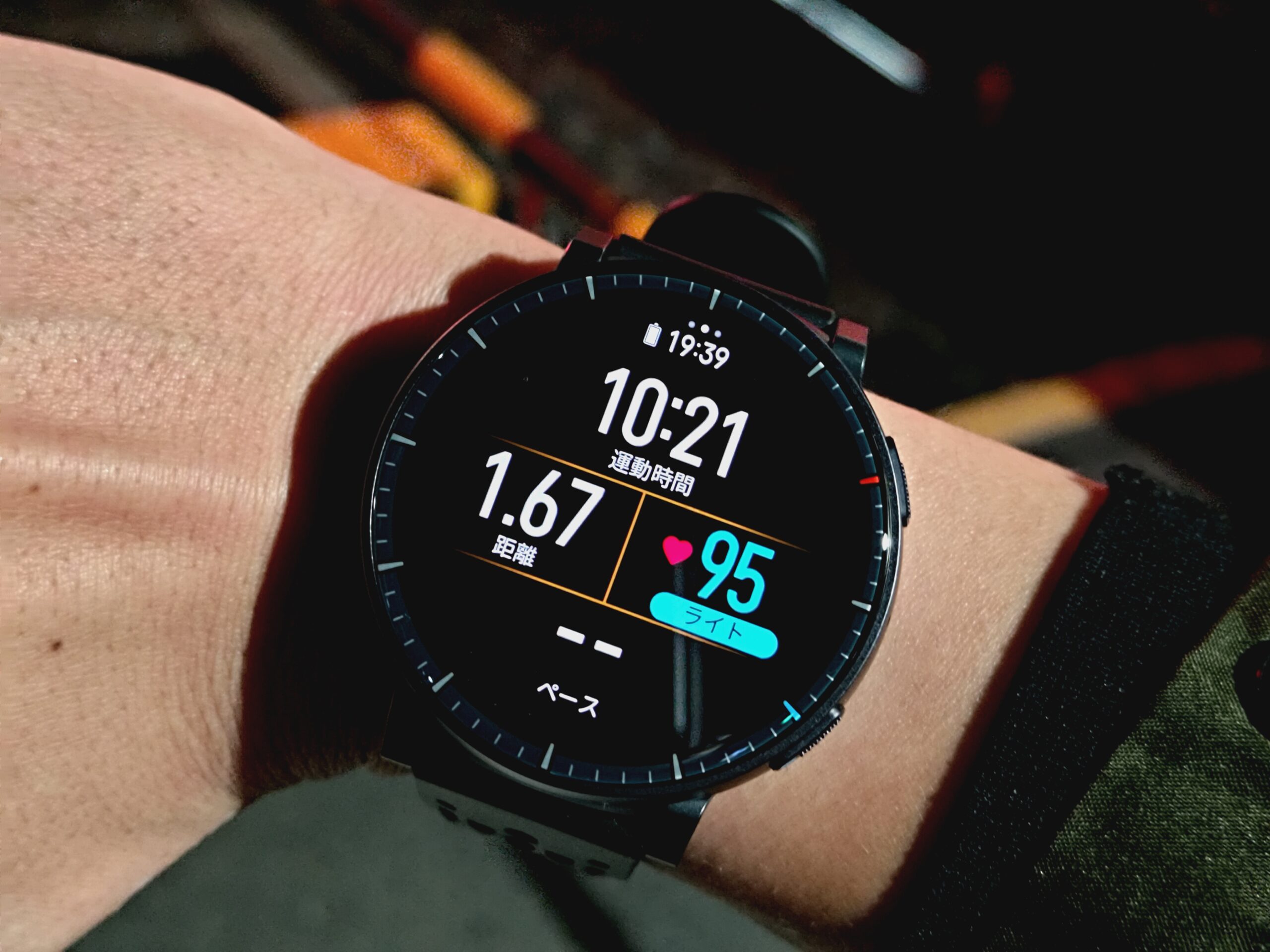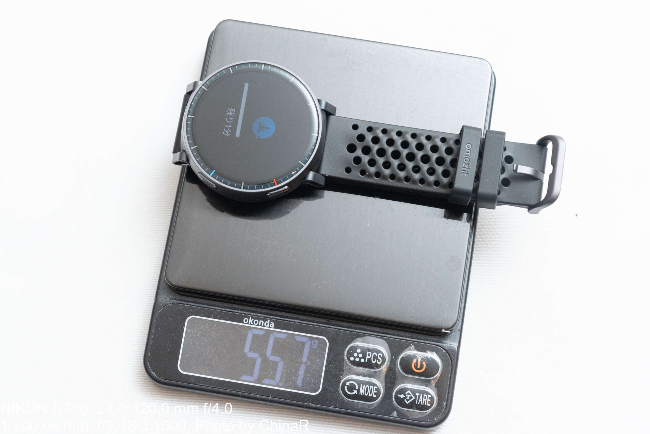 実測重量はバンドを含めて55.1gでした。これまで使っていたT-Rex 3 Pro(74.8g)に比べるとかなり軽量です。重いスマートウォッチに慣れてしまっているため特に違和感はありませんが、長時間装着する際には軽量なことは疲労感に直結するかと。また、厚みのないデザインなので、ワイシャツの袖口に引っかかるようなこともありませんでした。