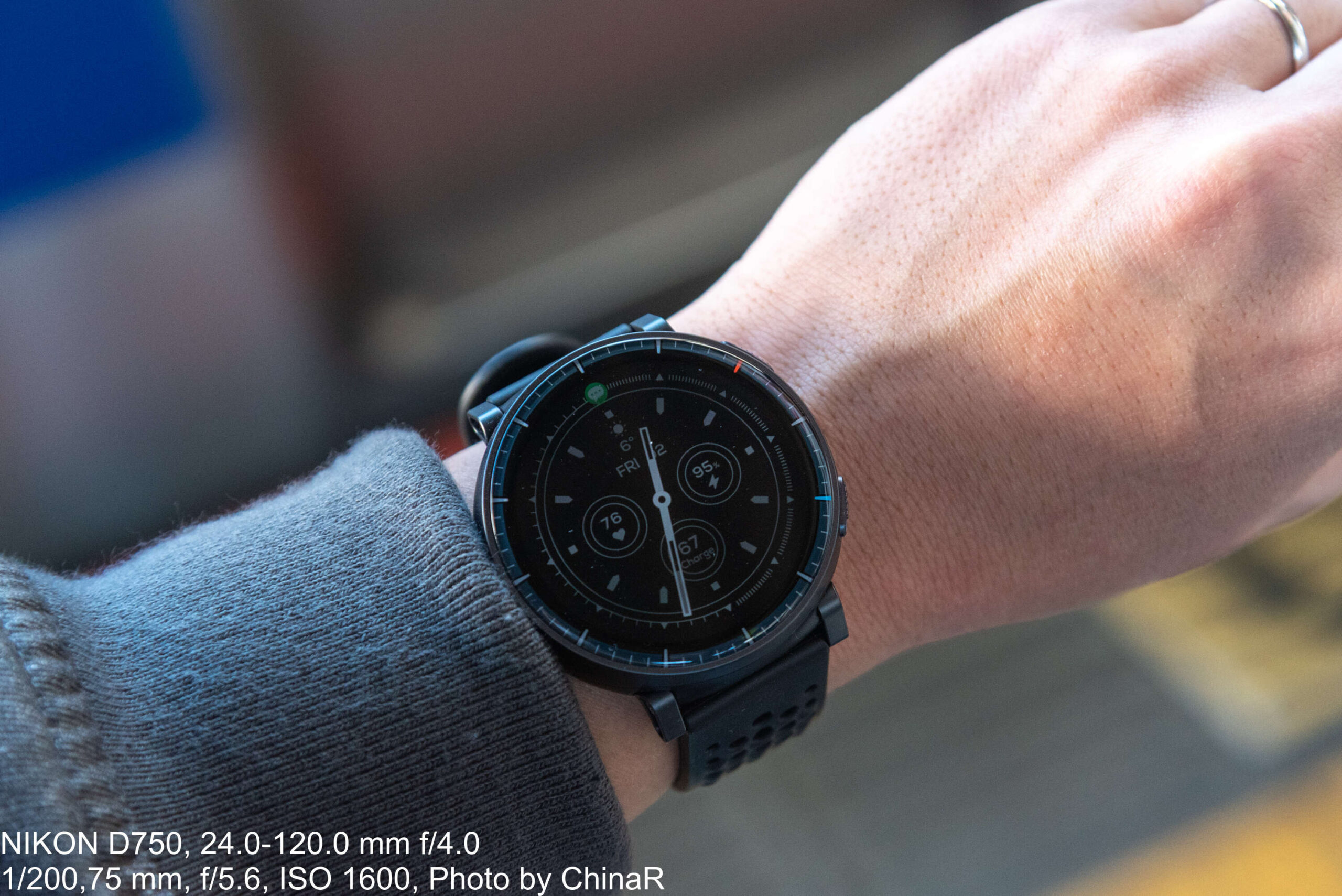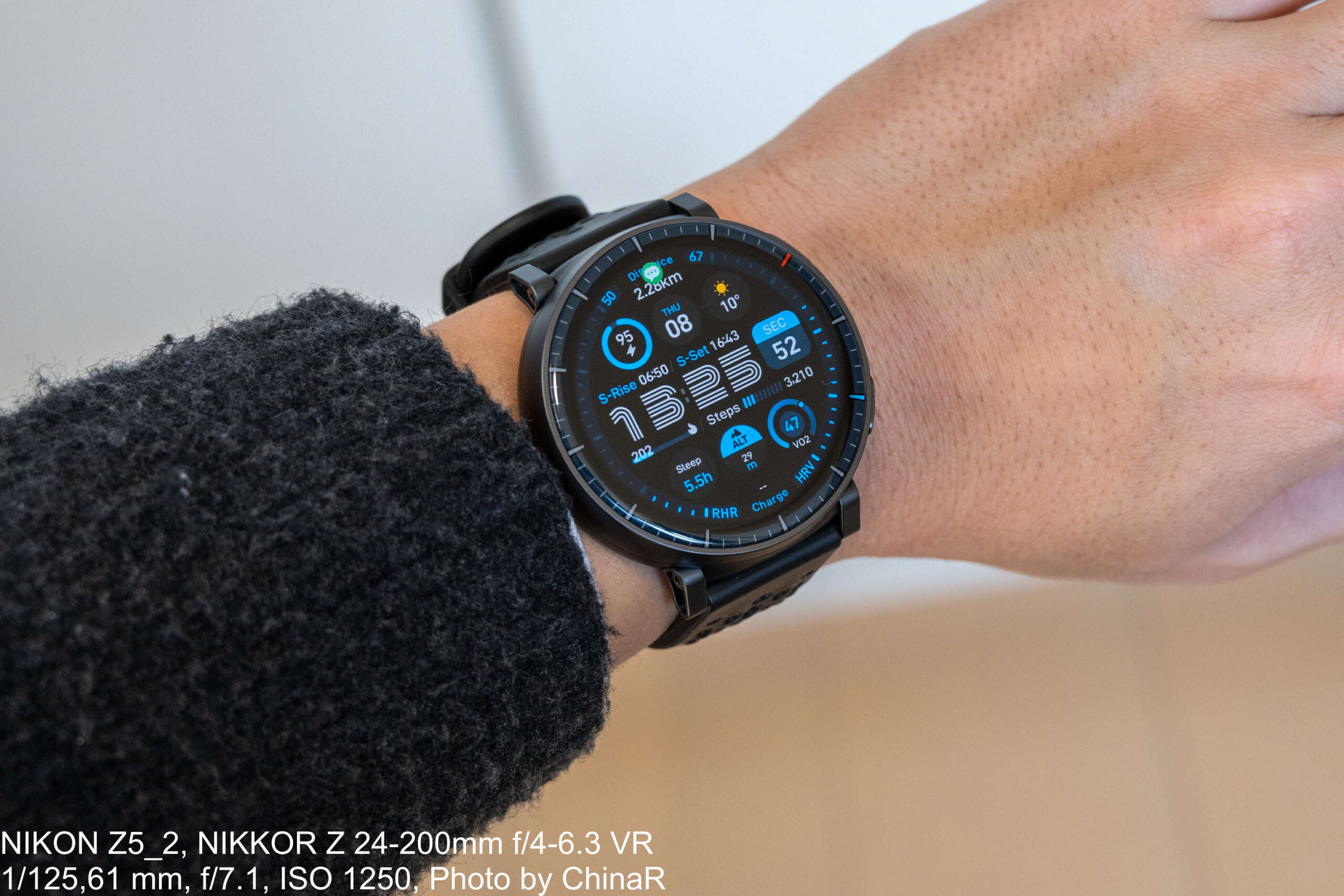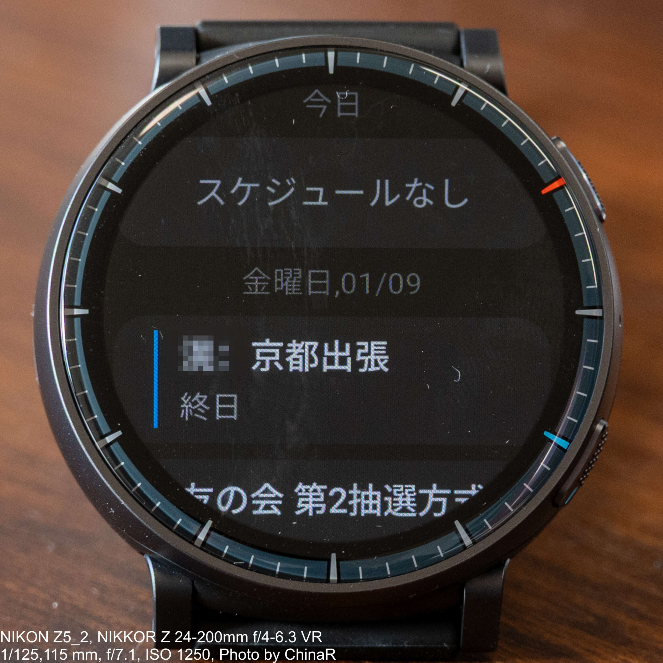 実測重量はバンドを含めて55.1gでした。これまで使っていたT-Rex 3 Pro(74.8g)に比べるとかなり軽量です。重いスマートウォッチに慣れてしまっているため特に違和感はありませんが、長時間装着する際には軽量なことは疲労感に直結するかと。また、厚みのないデザインなので、ワイシャツの袖口に引っかかるようなこともありませんでした。
