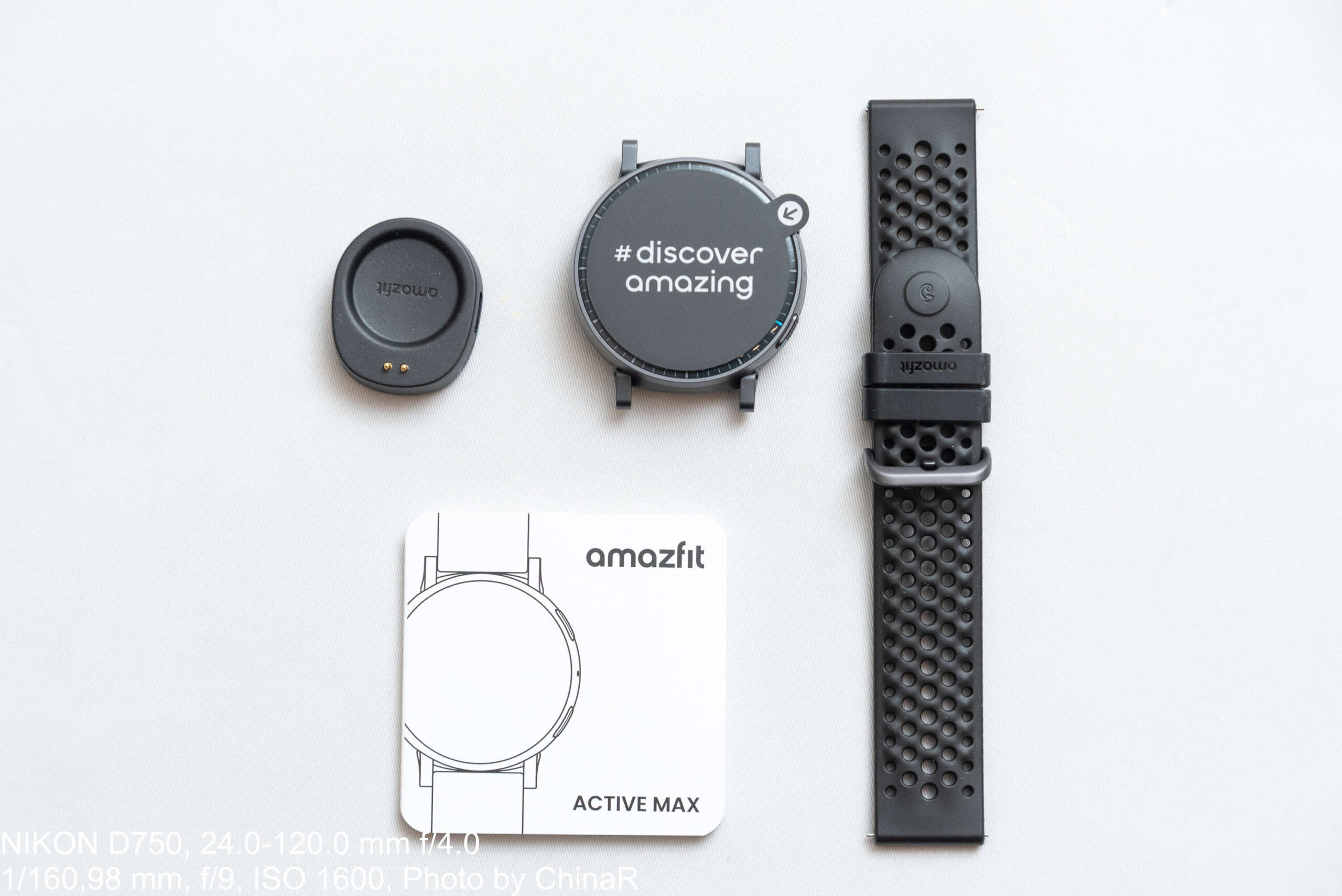 Amazfit Active Maxのパッケージは、Amazfitらしいシンプルなデザイン。長方形のボックスに製品写真が印刷されており、開封するとバンドが取り外された状態の本体と説明書、充電器が入っていました。バンドの取り付けにはクイックリリース機構を使って装着する形式で、初めての方は少し戸惑うかもしれませんが、一度覚えてしまえば簡単。私の場合は5分もかからずに完了しました。