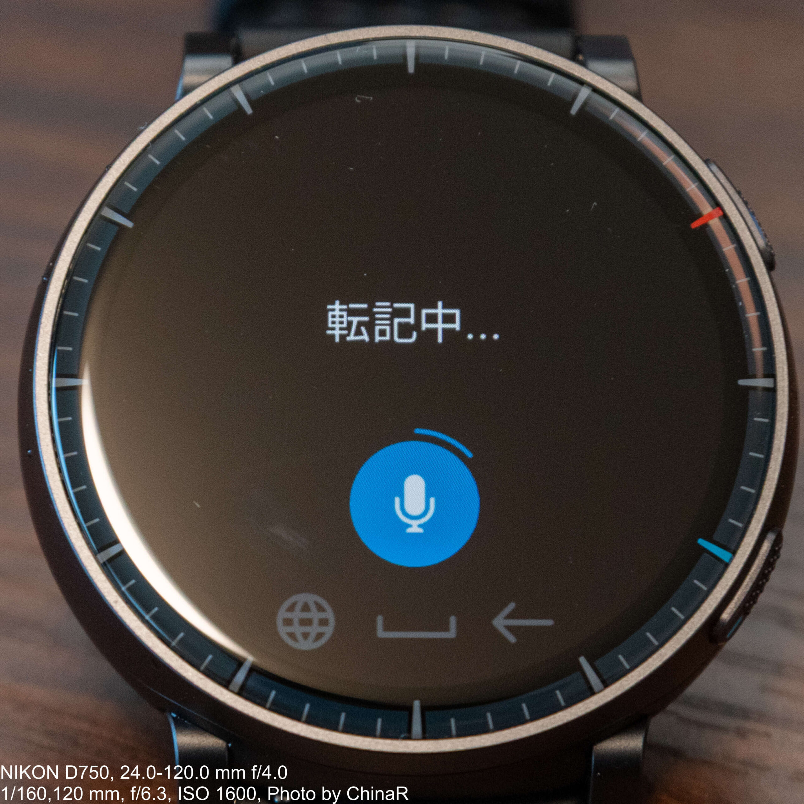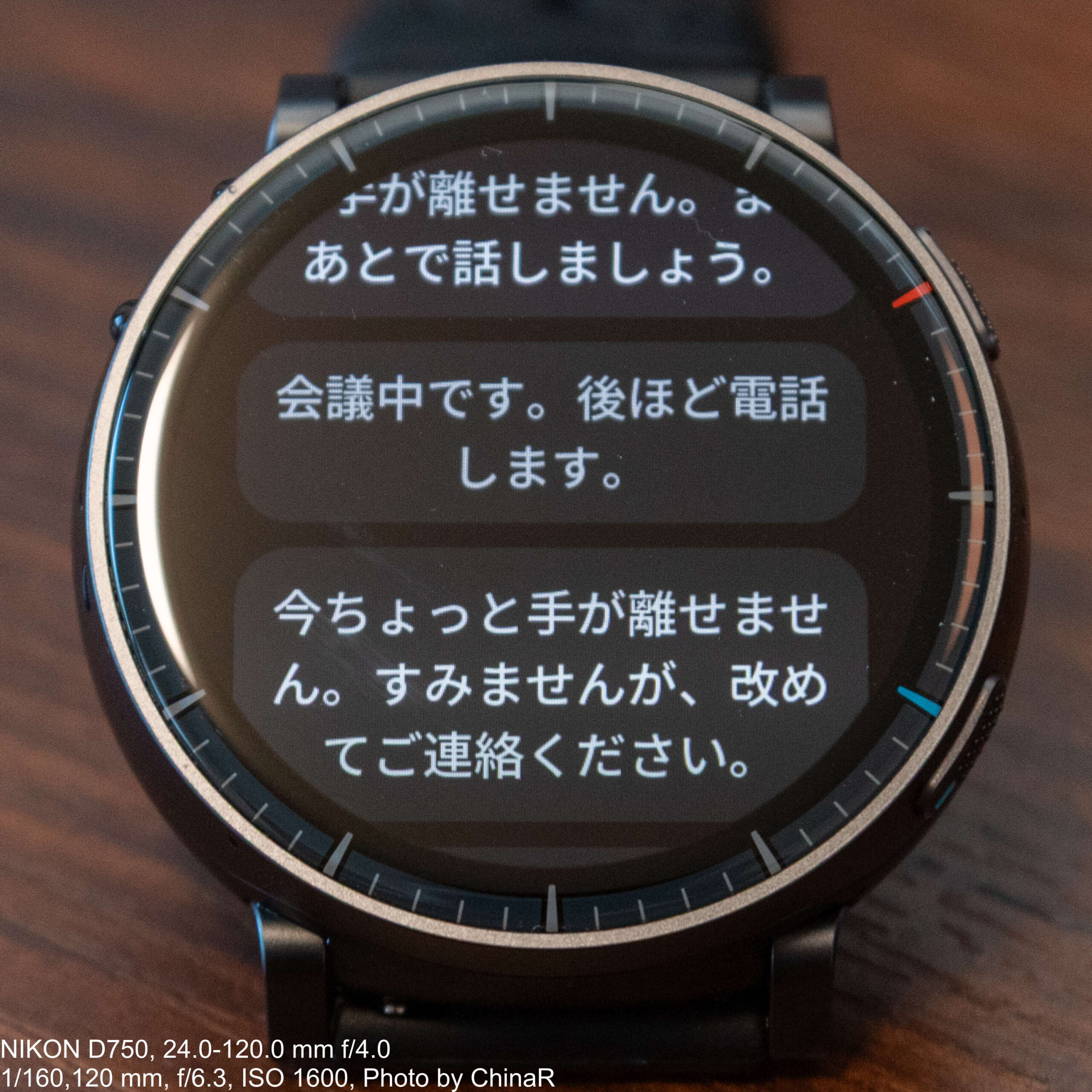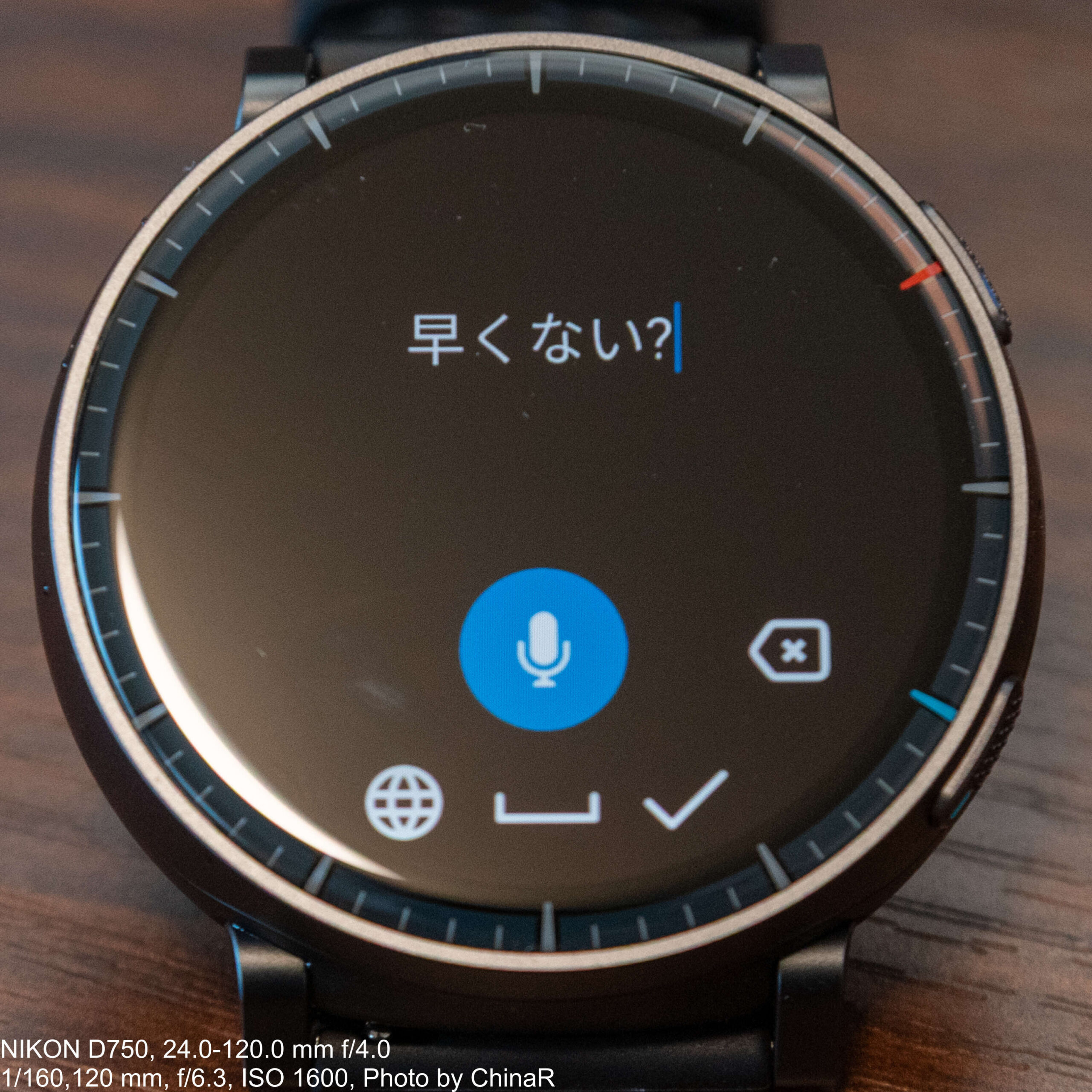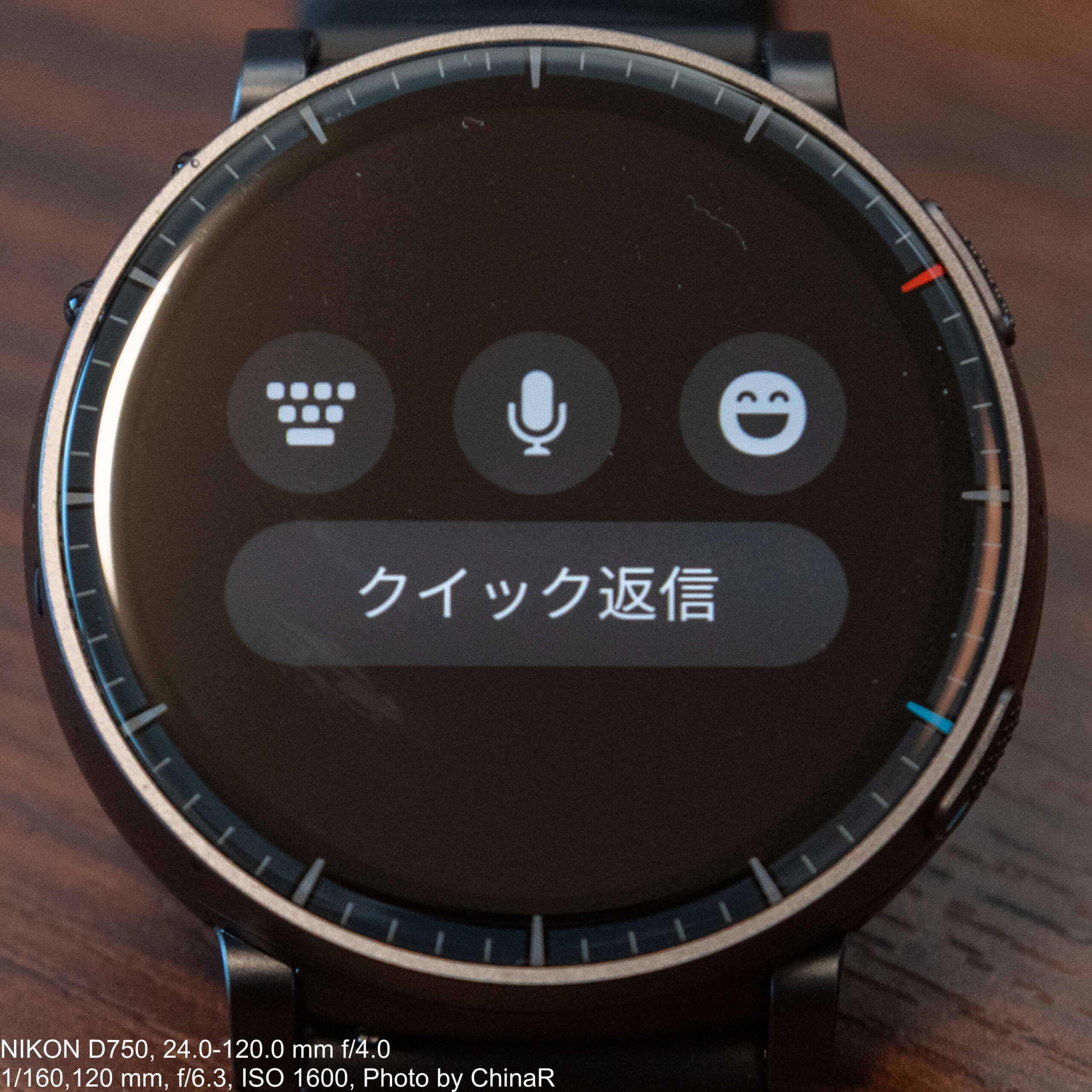 もう一つのポイントがLINEなどのSNSの通知に対する音声入力返信機能。通常のスマートウォッチでは、あらかじめ設定しておいた定型文での返信に対応していることが多いかと。本機でも”クイック返信”で設定した定型文からの返信をしたり、英語であればキーボードでの手入力も可能。ただ、これだと正直、”了解!”くらいのメッセージでしか使い道はありません。