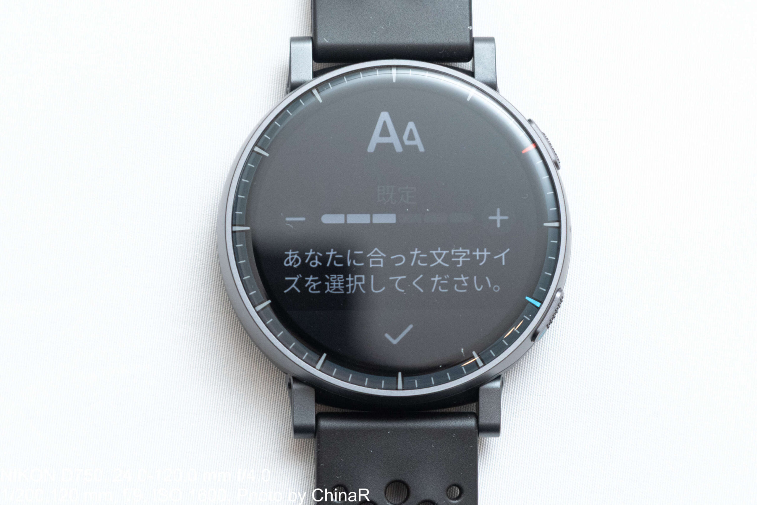 本体のデザインはシンプルそのもの。本機最大の特徴が、Activeシリーズで最大となる1.5インチAMOLEDディスプレイを搭載している点。480×480ピクセルの高解像度で、文字も画像も鮮明に表示されるのが魅力的です。Active 2(レビュー)の1.32インチから大幅にサイズアップしており、表示面積の拡大は想像以上に快適でした。特に通知の文章が見やすいのはもちろん、セットアップ時に文字サイズを選択できるのも便利なところ。