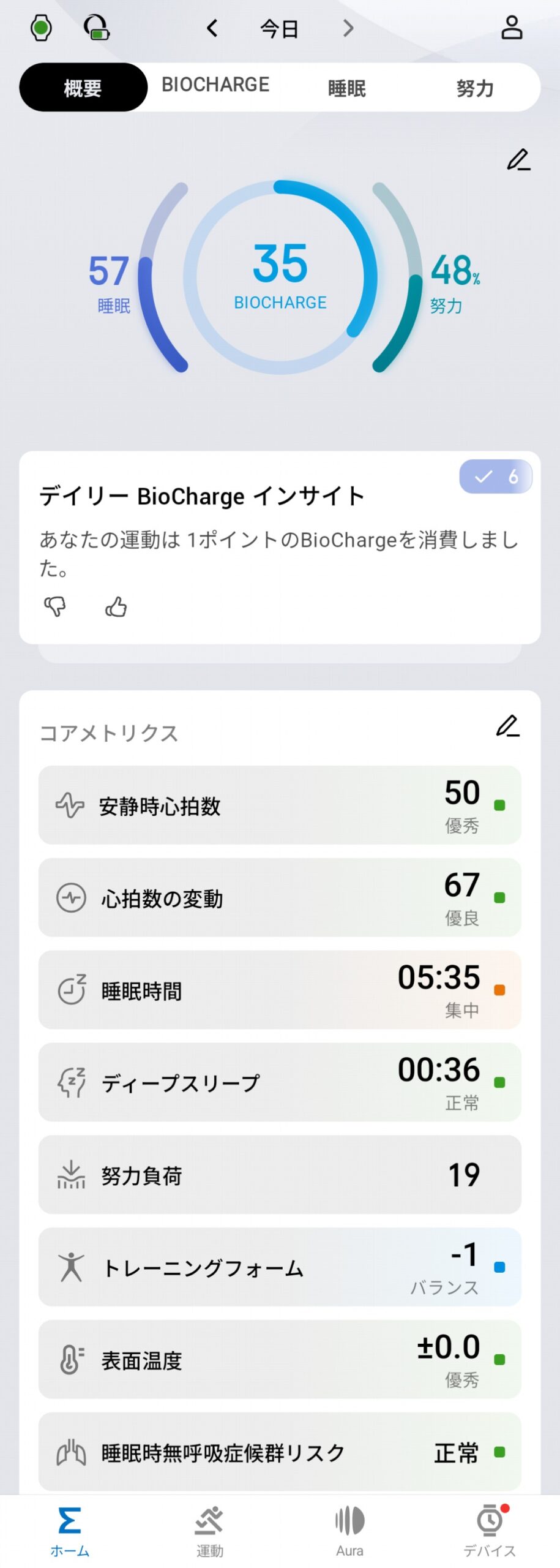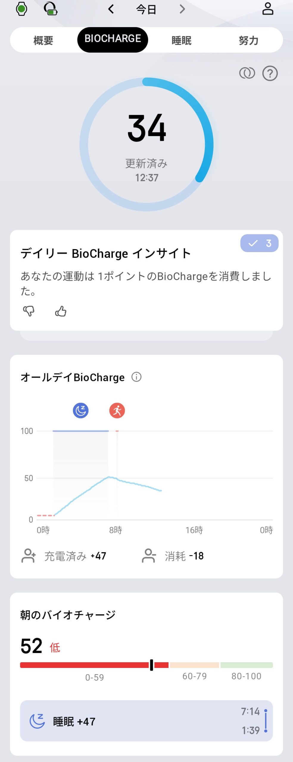オールデイBioChargeのグラフでは、睡眠による充電と運動による消耗が時間軸で表示されます。私の場合、充電済みが+47ポイント、消耗が-18ポイントという結果でした。朝のバイオチャージスコアも表示され、体調の良し悪しが一目でわかります。