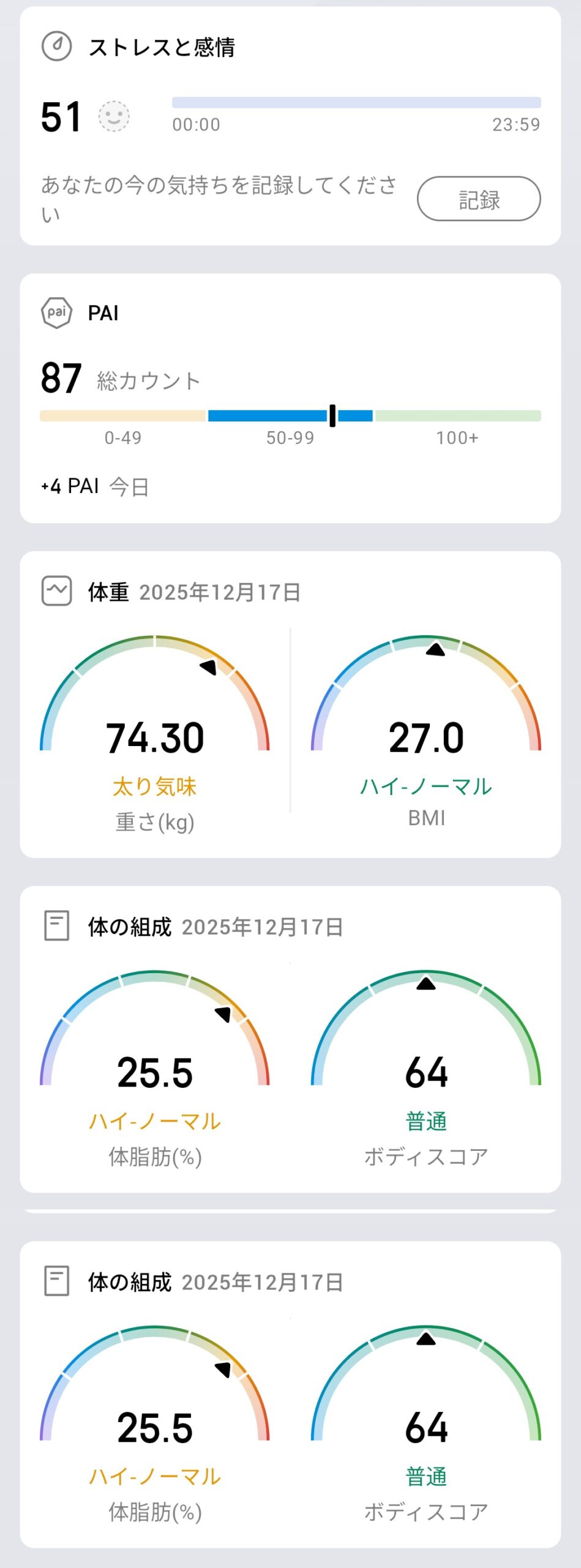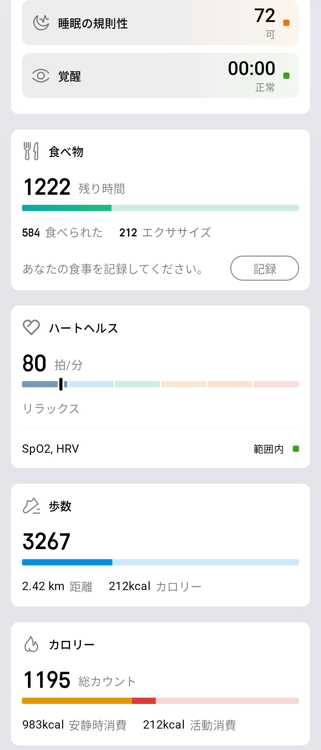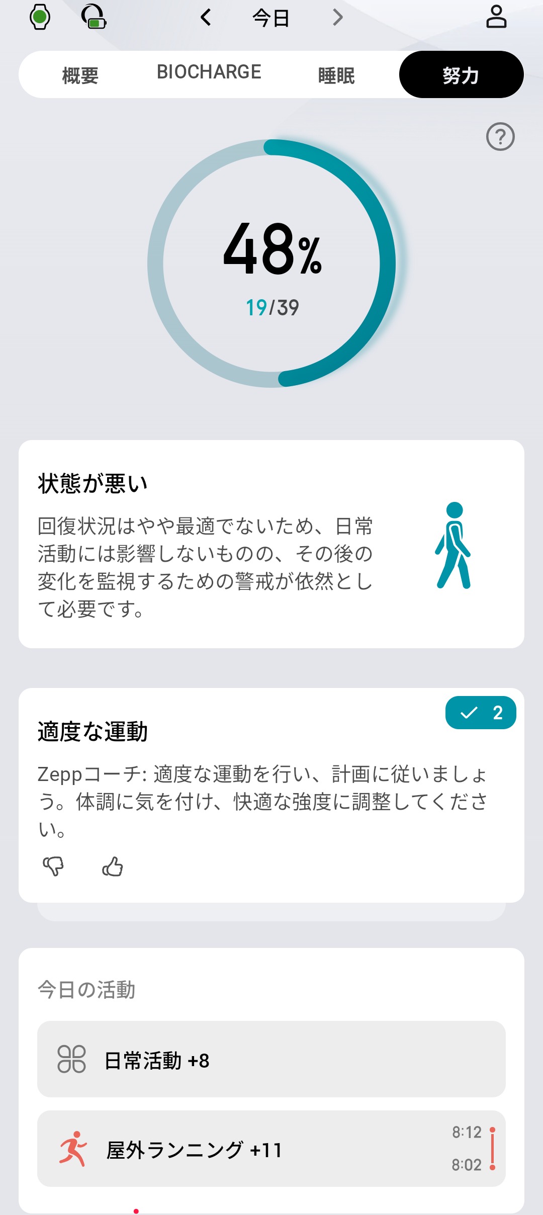 努力のタブでは、現在の身体の状態に対してどれだけ運動などのトレーニングを実施しているか、というのを分析してくれます。100%の状態になればOKですが、この目標はその日の疲労レベルや、後述するZeppコーチ機能の内容などで調整してくれるため、この指標だけ見ておけばOKという感じ。今日はどれだけ運動すればよいのか、というのをいちいち考える必要はありません。