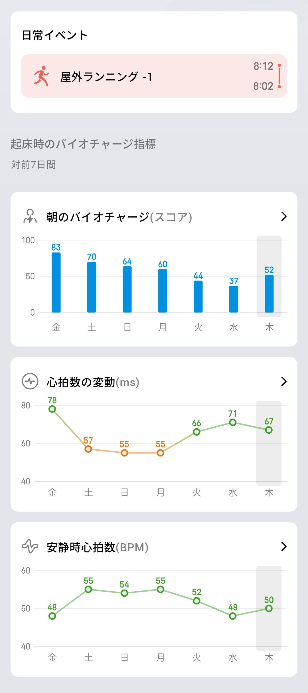 過去7日間の推移も確認でき、数値が日によって変化していく様子が把握できました。この数値を見ることで、疲労の蓄積具合や回復状態を客観的に把握できるわけです。心拍数の変動や安静時心拍数も記録されており、体調管理に役立ちます。