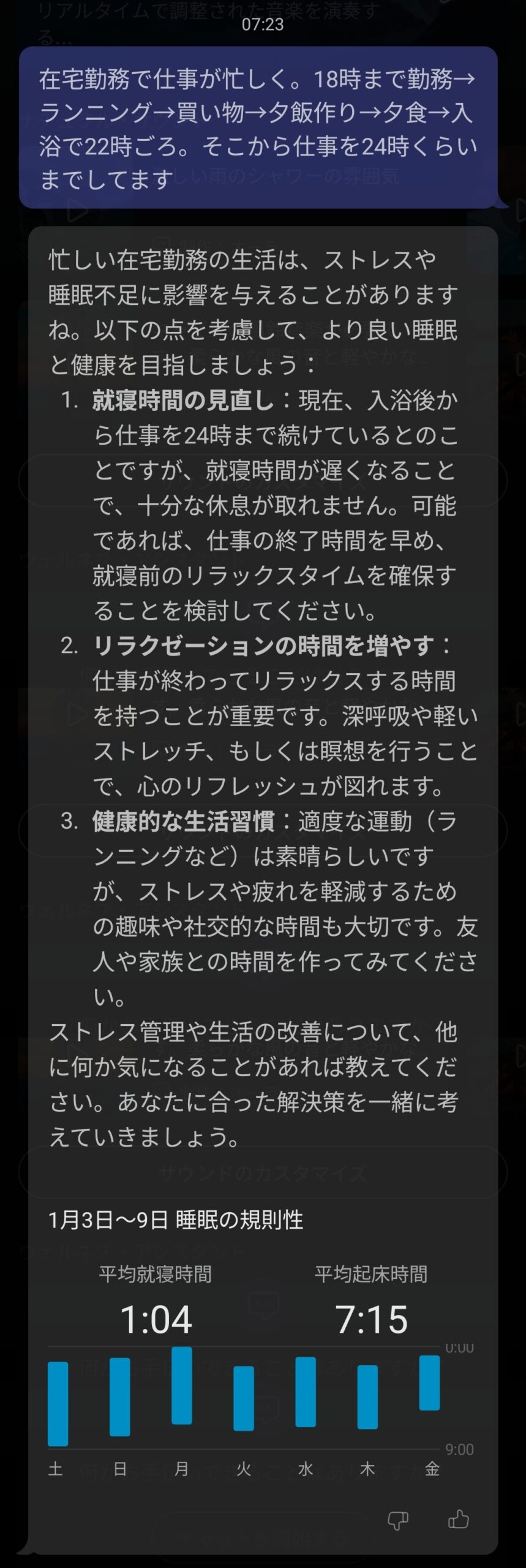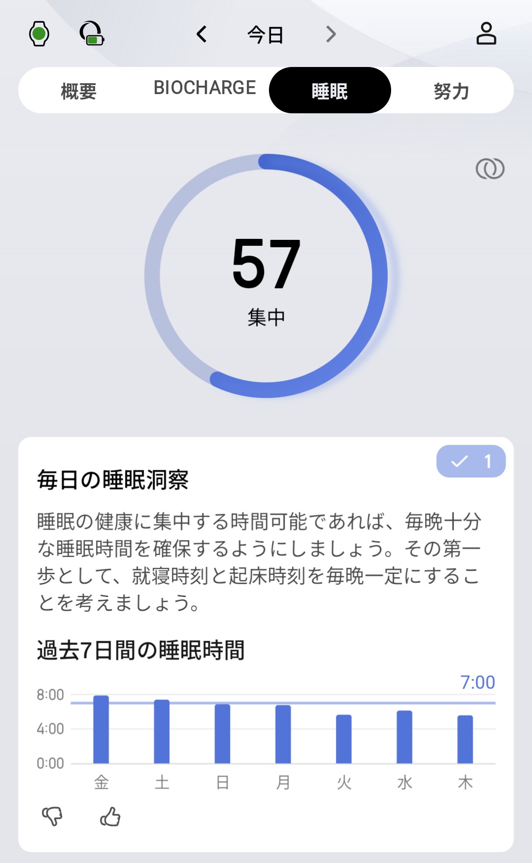 睡眠状況については驚くほど詳細に自動分析してくれます。睡眠スコアで評価され、毎日の睡眠洞察では「毎晩十分な睡眠時間を確保するようにしましょう」といった具体的なアドバイスが表示されます。