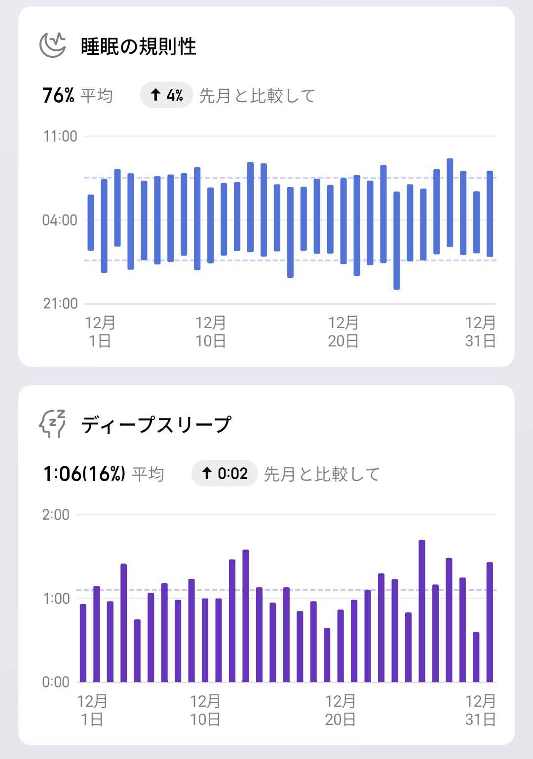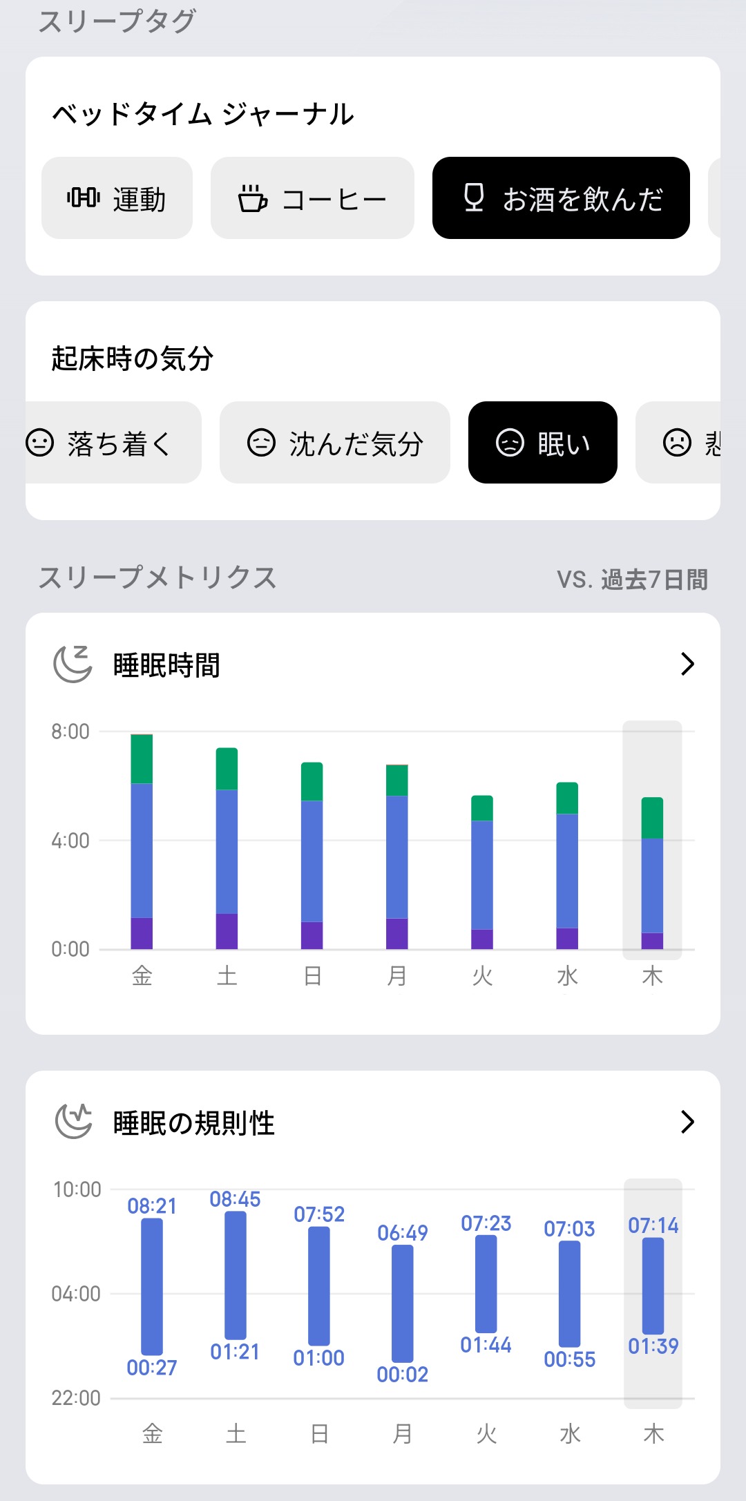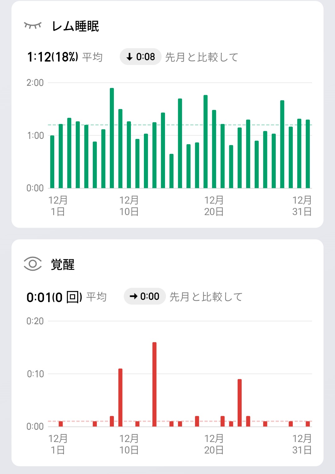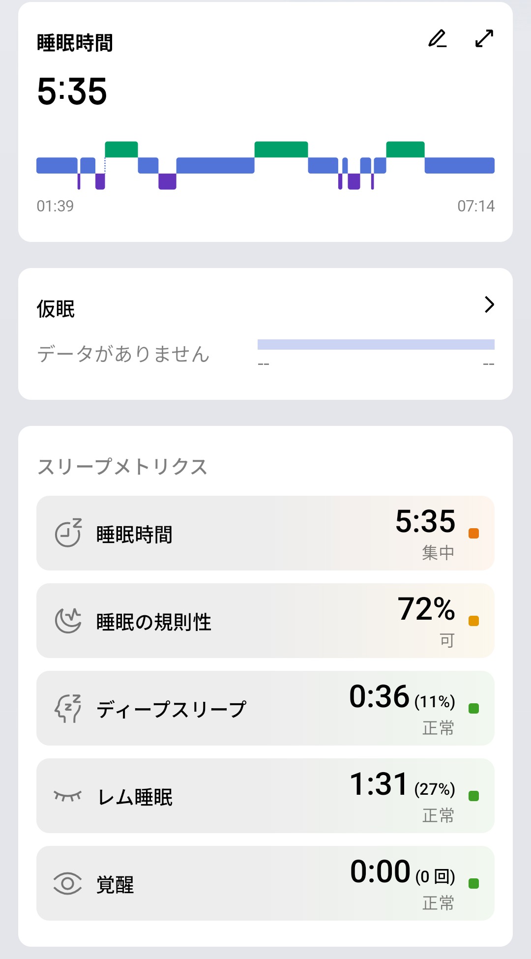 睡眠時間や睡眠の規則性に加えて、ディープスリープ、レム睡眠、覚醒回数まで細かく分析されています。睡眠時間のグラフを見ると、ディープスリープ(緑)、レム睡眠(青)、浅い睡眠(水色)が色分けして表示され、どのタイミングでどんな睡眠状態だったのかが一目瞭然です。