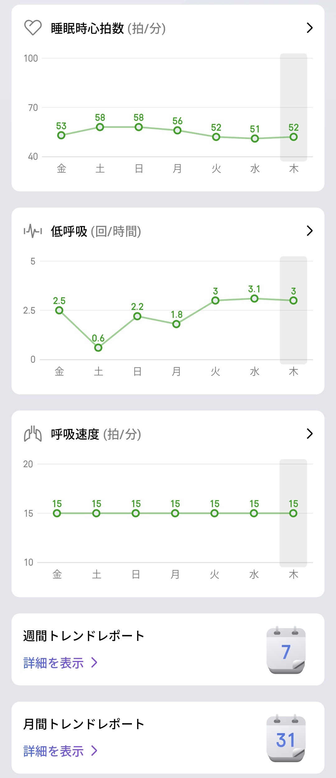 スリープタグ機能も便利で、ベッドタイムジャーナルとして「運動」「コーヒー」「お酒を飲んだ」といった就寝前の行動を記録でき、起床時の気分も選択できます。これによって、どんな行動が睡眠の質に影響するのかを分析できるわけです。睡眠時心拍数や低呼吸(睡眠時無呼吸症候群のリスク指標)、呼吸速度も記録されており、睡眠中の呼吸状態まで把握できます。
