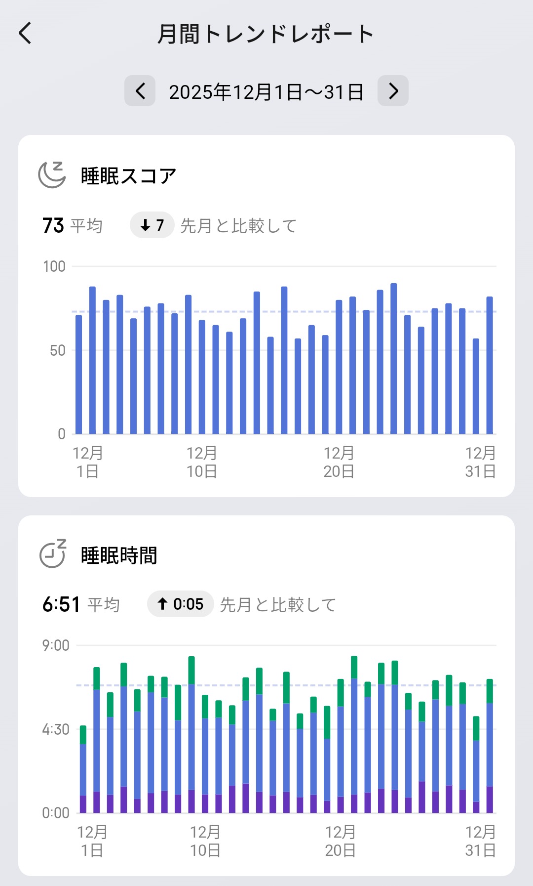 月間トレンドレポートでは、睡眠スコアの平均や睡眠時間の推移がグラフで表示され、長期的な睡眠パターンの把握が容易。睡眠の状態などは1日毎の結果で一喜一憂するよりは、月単位や年単位といった広い範囲で確認することで、長期的な傾向を掴むことが可能に。この過去の傾向も含めて簡単に見れるのもAmazfit Active MAXの嬉しいポイントでした。