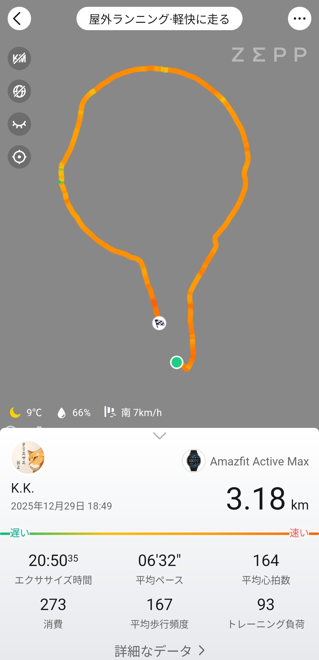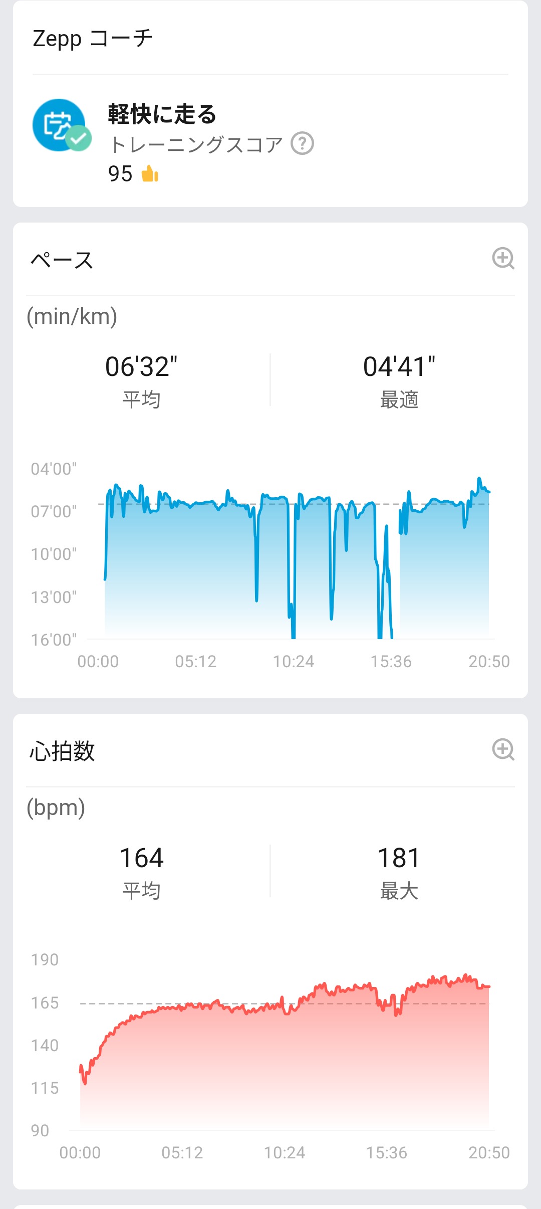 トレーニング中は、ウォッチ画面に現在のペース、心拍数、経過時間などが表示され、目標ペースとの差も確認できます。運動後は、Zeppコーチが今回のトレーニングを分析し、「目標ペースを維持できました」「心拍数が高めでした」といった具体的なフィードバックをくれるのも便利でした。