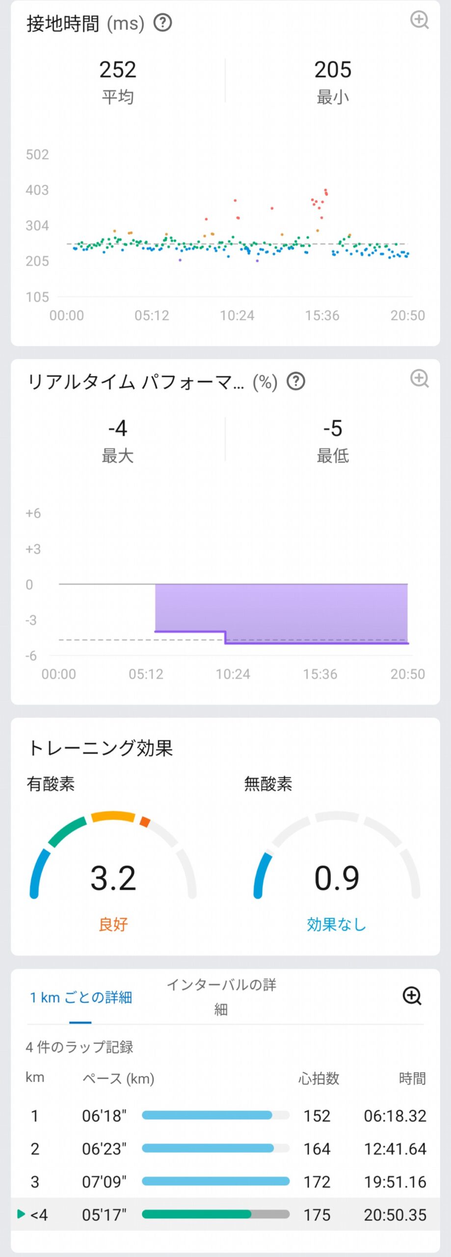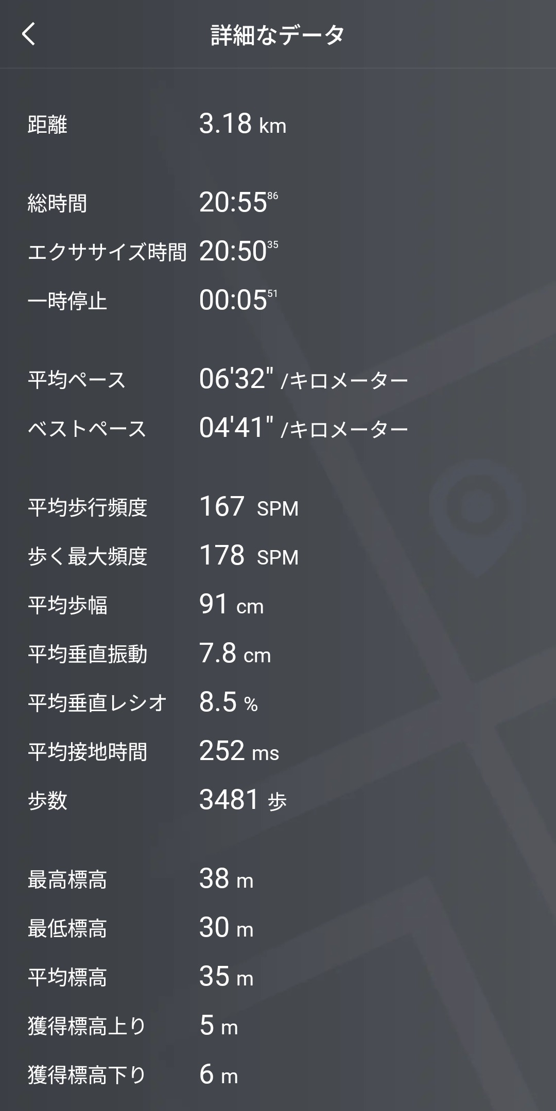 運動後はZeppアプリで驚くほど詳細なデータを確認できるのが嬉しいところ。距離や総時間、エクササイズ時間はもちろん、平均ペース、ベストペース、平均歩行頻度、歩く最大頻度、平均歩幅、平均垂直振動、平均垂直レシオ、平均接地時間、歩数まで記録されていました。