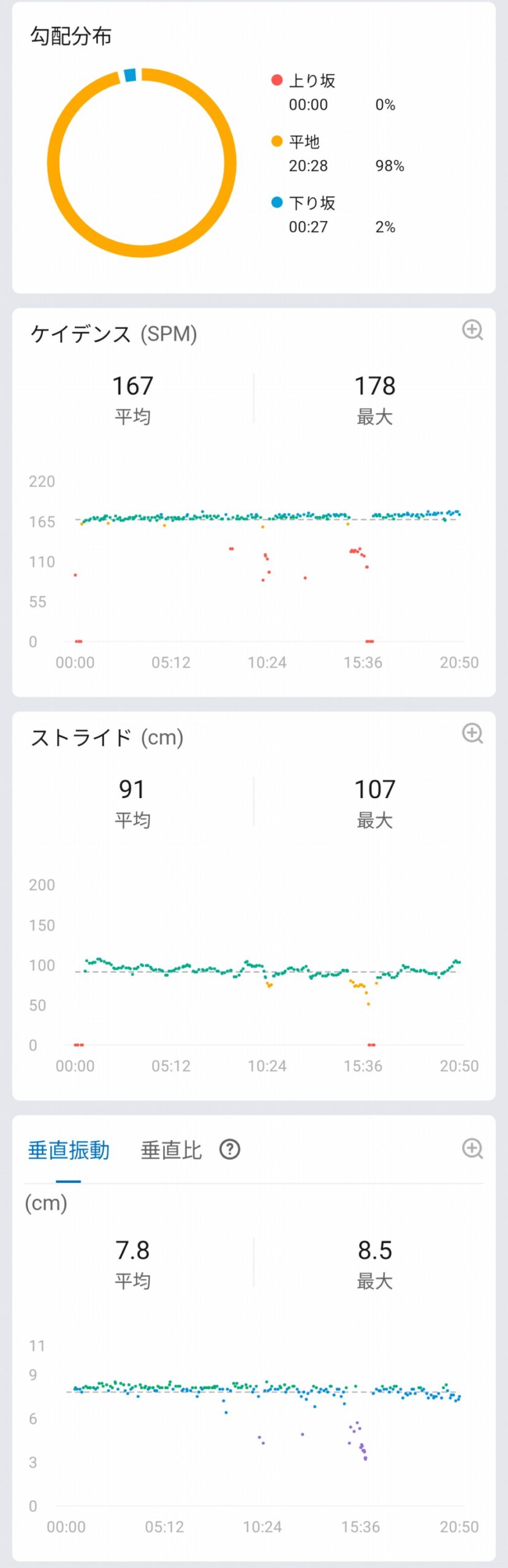 勾配分布も円グラフで表示され、平地と坂道の比率が確認できました。ケイデンス(歩行頻度)やストライド(歩幅)の推移もグラフで確認でき、平均値と最大値が表示されます。
