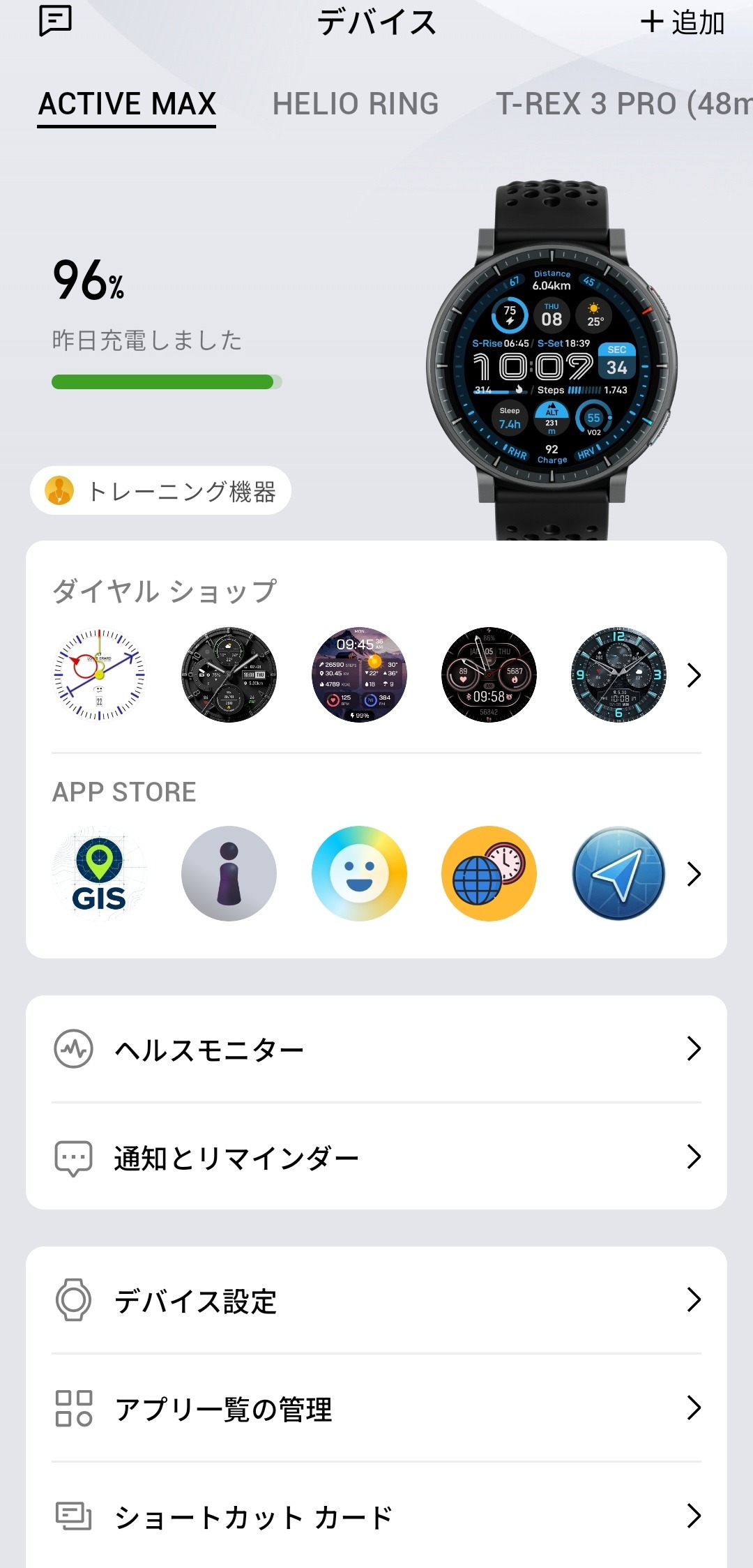 ペアリングはスムーズそのものでした。Amazfit Active Maxを起動すると画面にQRコードが表示されるので、Zeppアプリでこれを読み込むだけで完了です。特に便利だったのが、既存のAmazfitスマートウォッチを使っている場合、その設定を自動的に同期してくれる機能。通知の設定や24時間の心拍数測定などを一から設定し直す必要がなく、すぐに使い始めることができました。