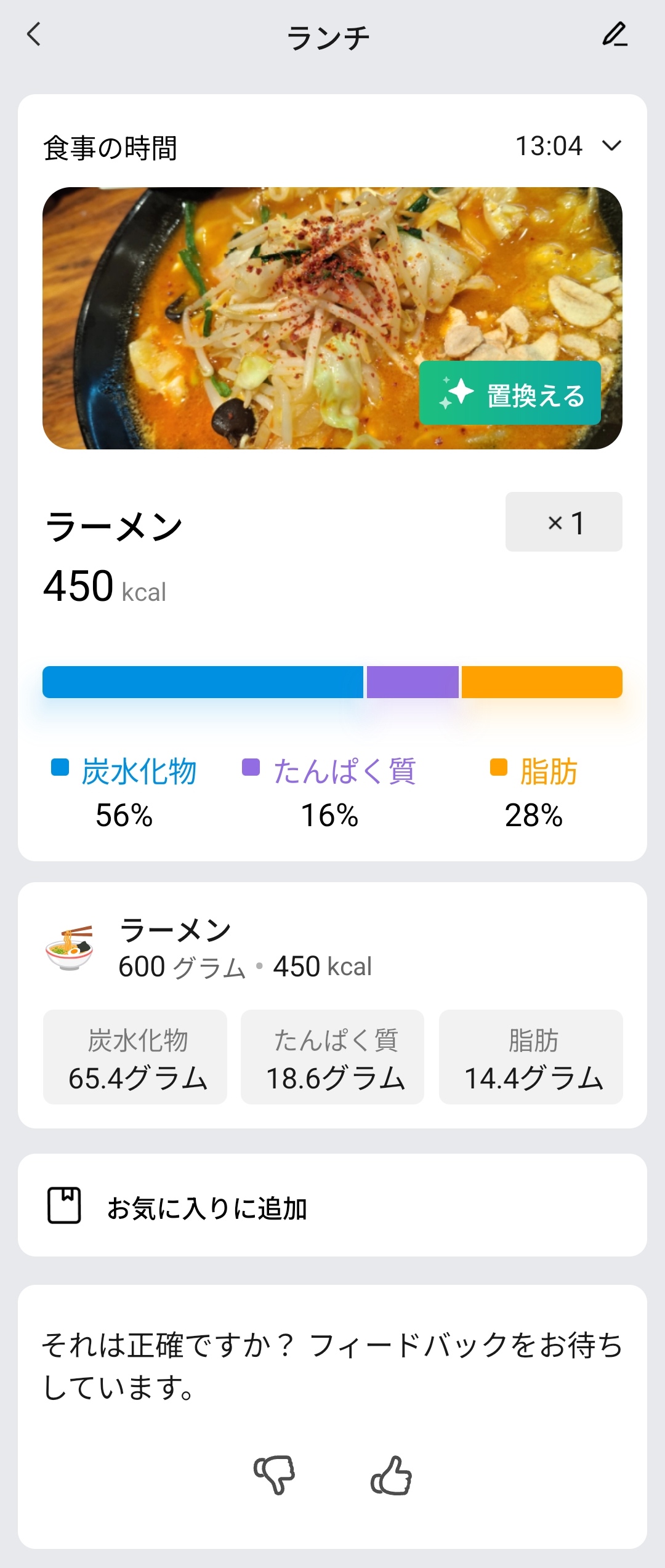 実際に試したところ、ラーメンの写真から「ラーメン450kcal」と正確に認識し、炭水化物、たんぱく質、脂肪の比率まで表示してくれました。完全に「あすけん」ほど詳細ではありませんが、簡易的な栄養素分析としては十分実用的です。ただ、ちょっとカロリーについては控えめな表示。日本人はもうちょっと脂っこいものを食べているので、必要に応じて画面上でカロリーや量は調整するとよいかと。