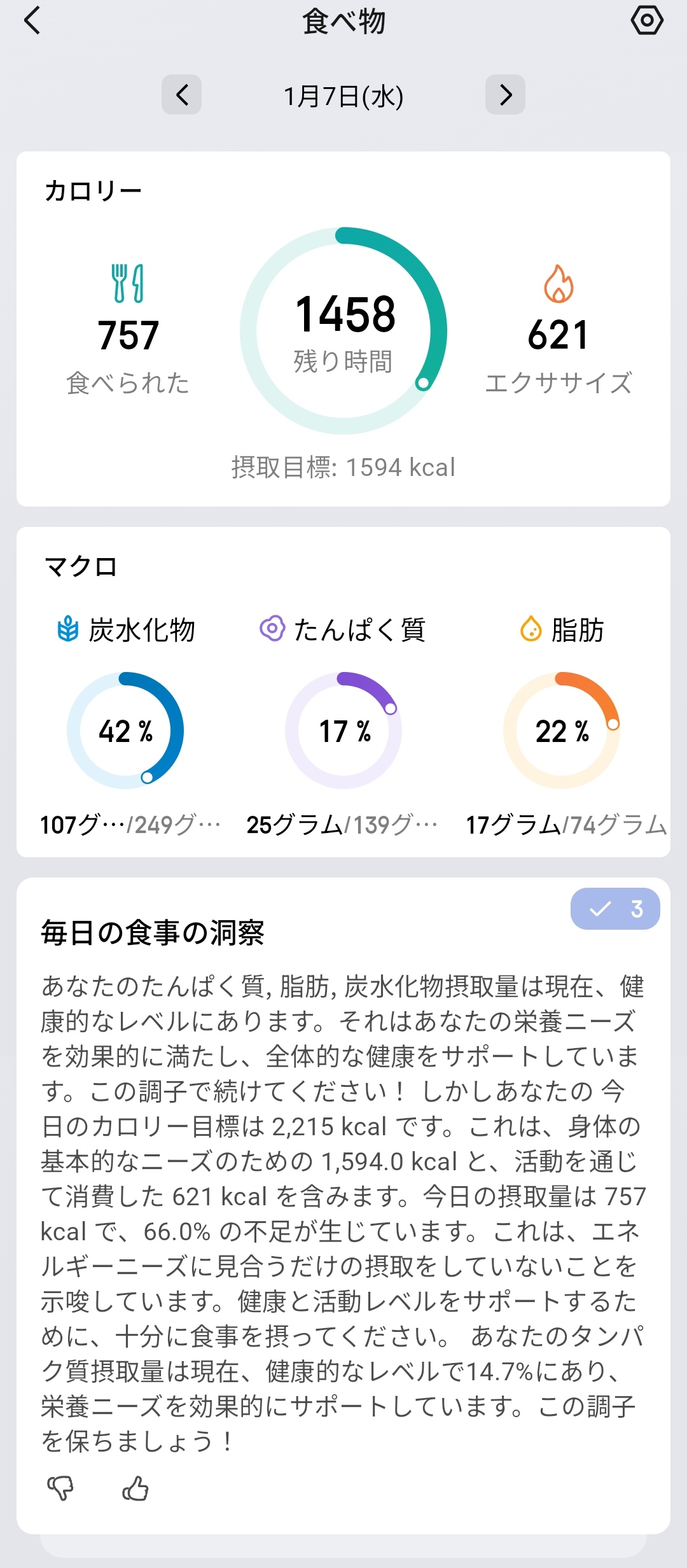 さらに便利なのが、一日の消費カロリーとの比較機能とアドバイス機能。摂取カロリーと消費カロリーのバランスを見ながら、AIが具体的なアドバイスを提供してくれます。健康管理を始めたい方には非常に有用な機能に仕上がっています。