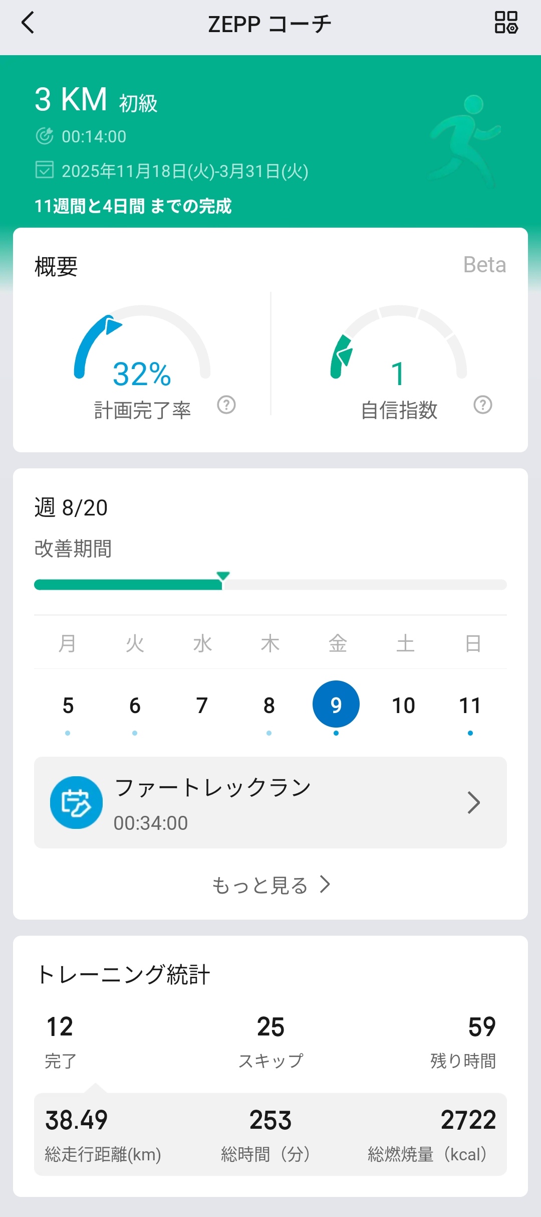 Amazfit Active MaxにはZeppコーチという機能も搭載されているのがポイント。ユーザーの運動履歴や目標に基づいてトレーニングプランを自動生成してくれます。Zeppコーチでトレーニングプランを作成する流れは非常にシンプルです。まず、Zeppアプリの運動タブから「私のトレーニングプラン」を選択。すると、目標設定画面が表示されるので、「5kmを30分以内で走る」「フルマラソンを完走する」「体重を減らす」といった具体的な目標から選べます。