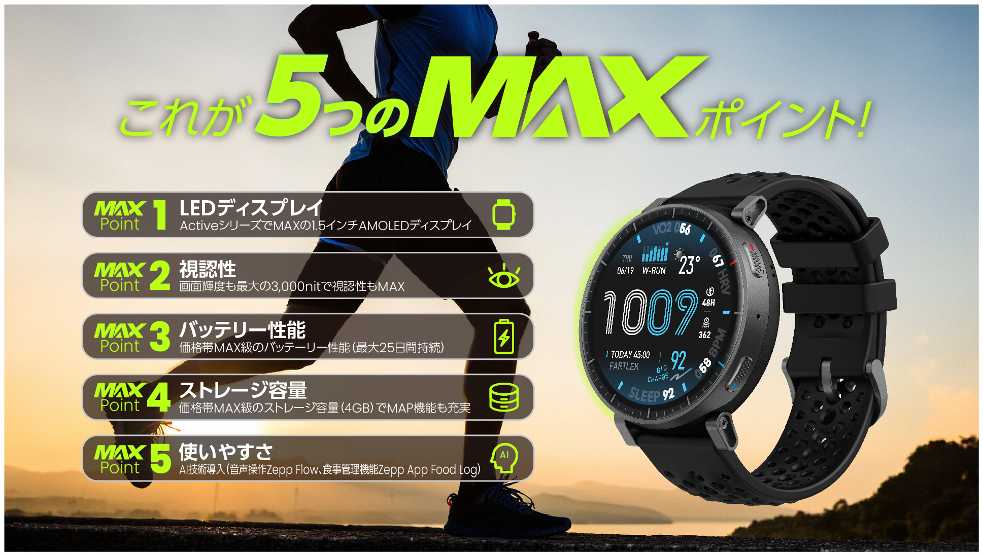 Amazfit Active Maxの最大の特徴は、その名の通り「MAX」を冠した5つの機能。それぞれがActiveシリーズの中で最大級のスペックを誇り、28,900円という価格帯では考えられないほど充実した内容となっているのもポイントです。
