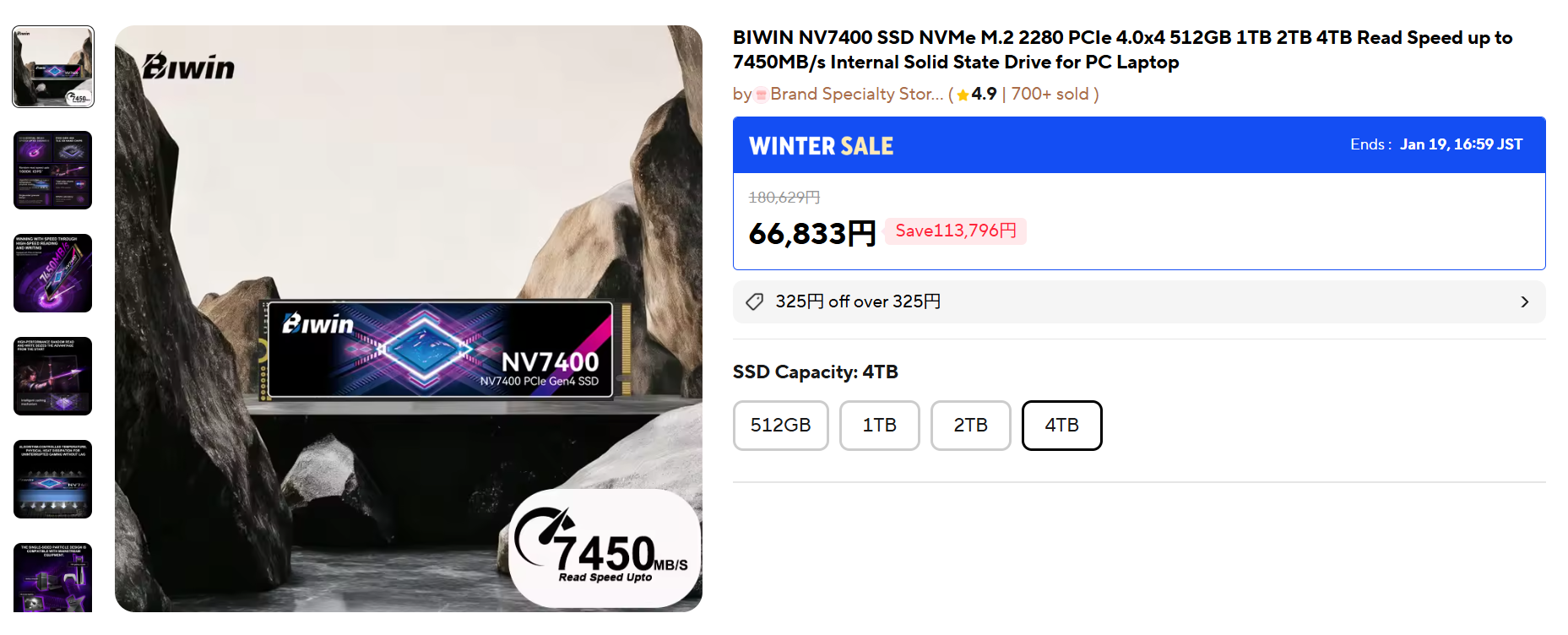 しかし、編集作業の増加に伴い、さらに4TBのストレージが必要になってきました。2026年1月、再びBiwin NV7400を検討したところ、Amazonでは在庫切れ、AliExpressでも6万円台後半という価格で、わずか半年で2倍以上の値上がりという状況です。7月に3万円台前半で購入できたモデルが、同じ仕様で6万円を超えるというのは、いくら市況が厳しいとはいえ受け入れがたい価格帯。この状況を踏まえ、国内外を問わずBiwin NV7400の再購入は現実的ではないと判断し、AliExpressで他のメーカー・モデルを含めた幅広い調達を検討することにしました。