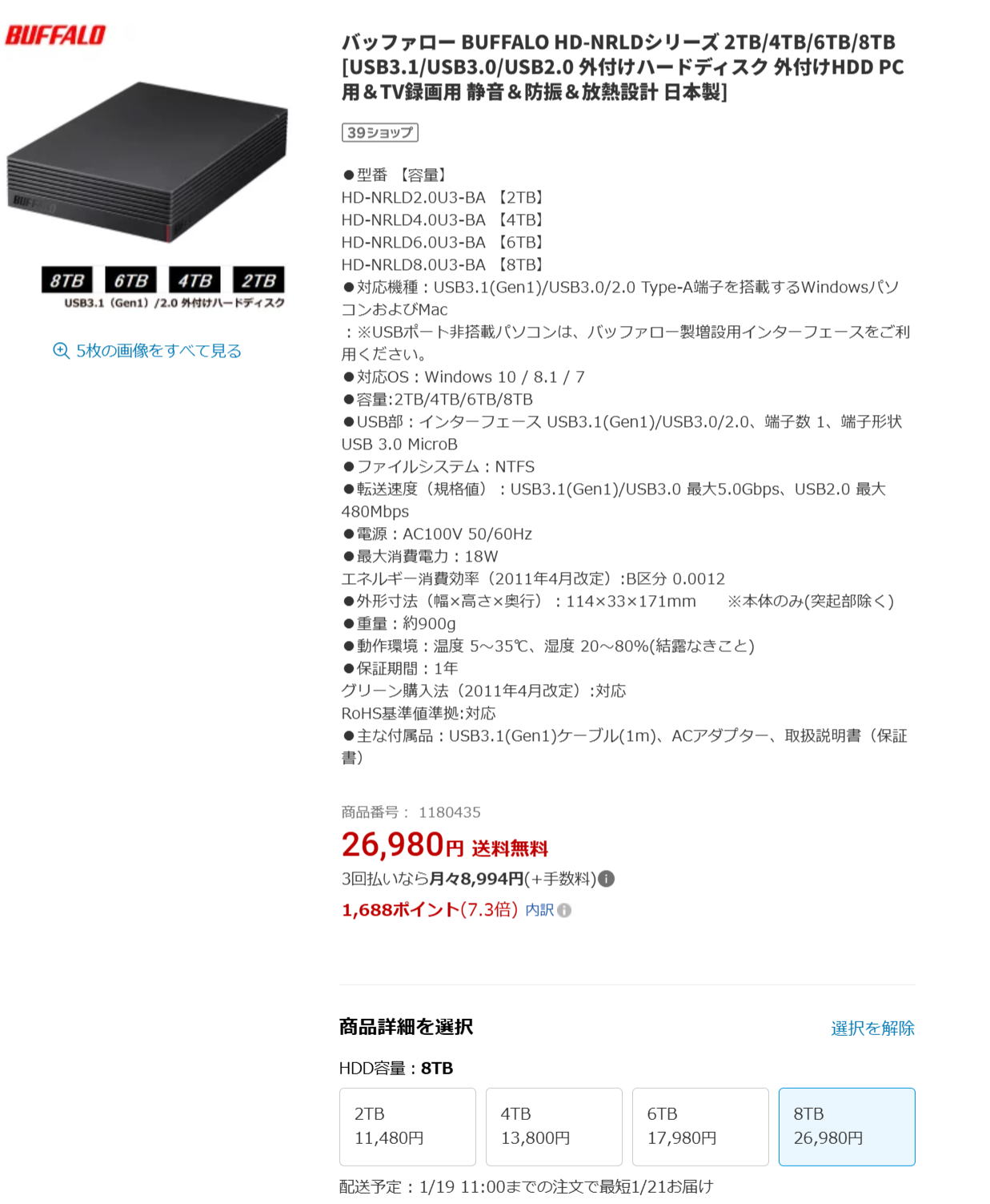 この厳しすぎるHDDの司教を踏まえて、今回はこの状況下で、Buffalo HD-NRLDシリーズ 8TBを26,980円で購入することを決断。HDDの回転数を求めるわけではなかったので、何でも良いから8TBの新品のHDDを手に入れようとすると、外付けモデルというのは穴場。実際、バルクのSeagate BarraCuda 8TB(ST8000DM004)が30,980円なのに対し、ケースがついてくるとなぜか26,980円になるわけで不思議なものです。