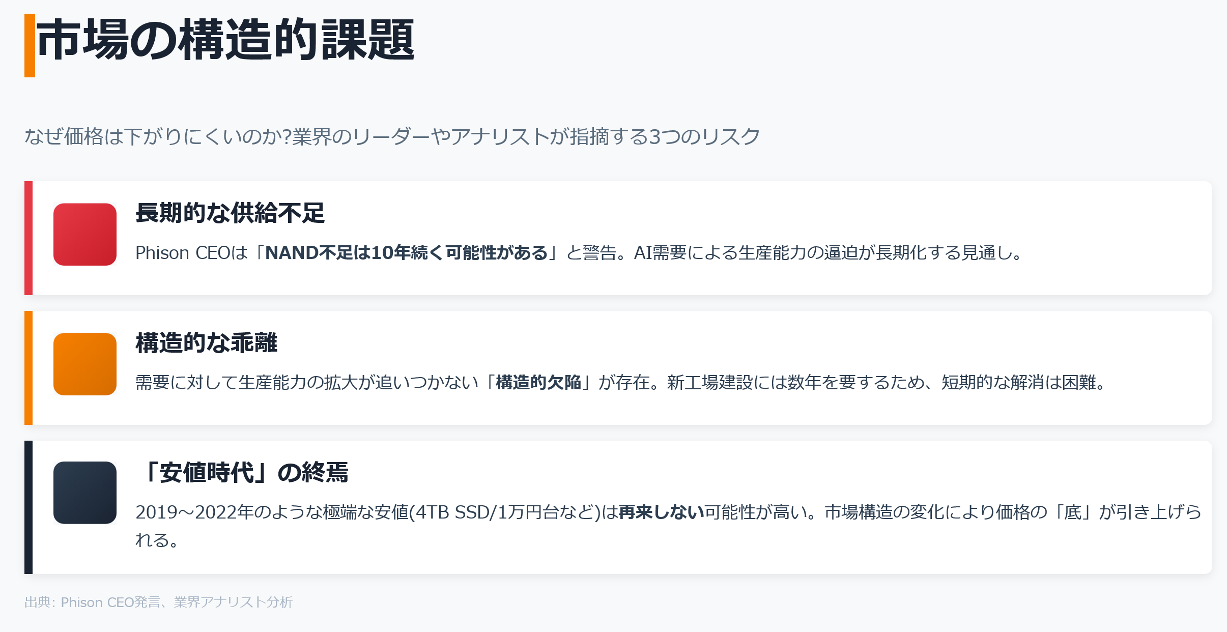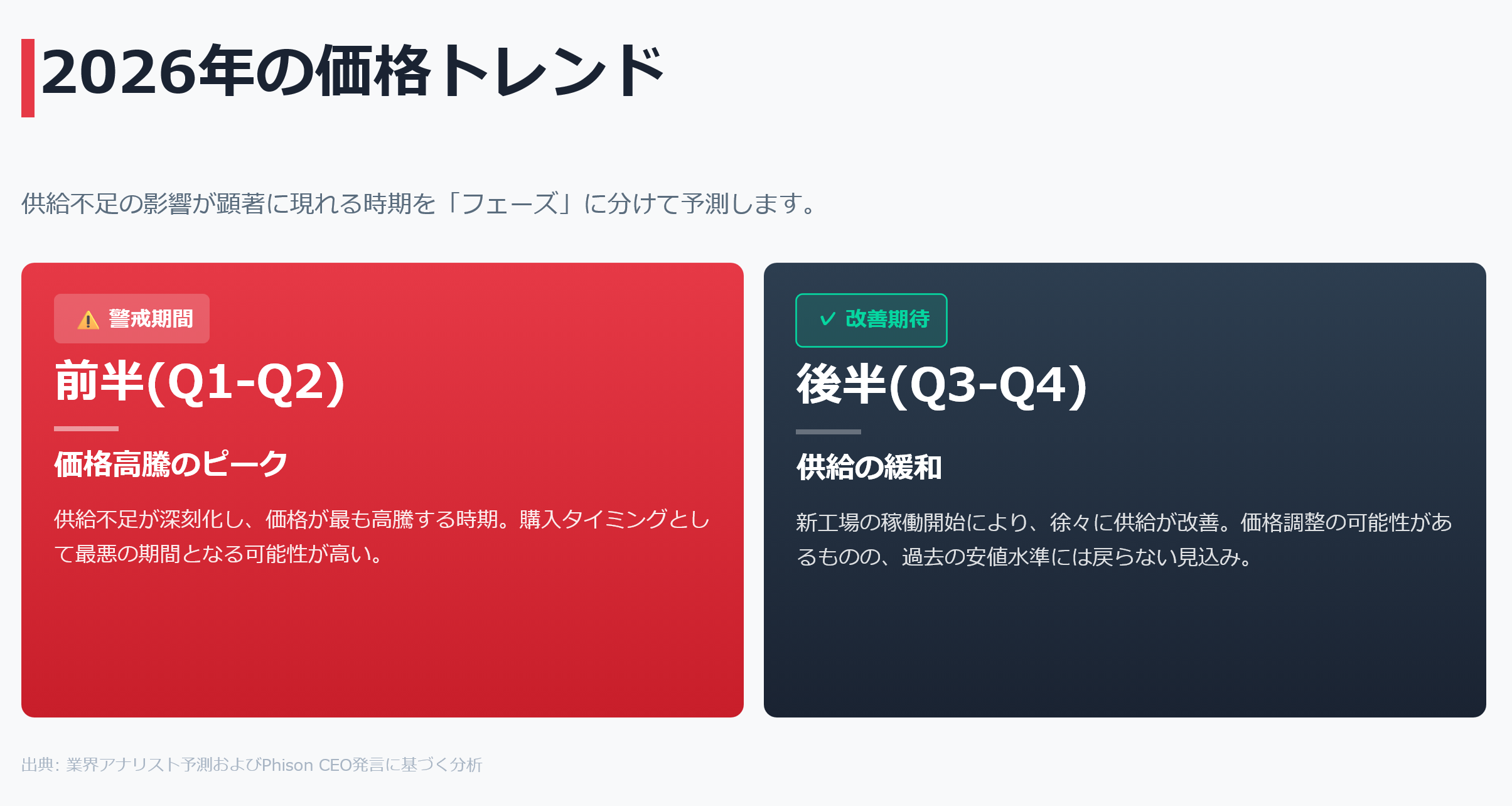 多くのアナリストが一致して指摘しているのは、2026年前半(Q1~Q2)が価格高騰の最悪期になるという見通しです。DRAMとNANDフラッシュの供給不足は構造的な問題であり、短期間で解消する見込みは薄いとされています。Phison CEOは「NAND不足は10年続く可能性がある」とまで発言しており、悲観論も根強い状況です。