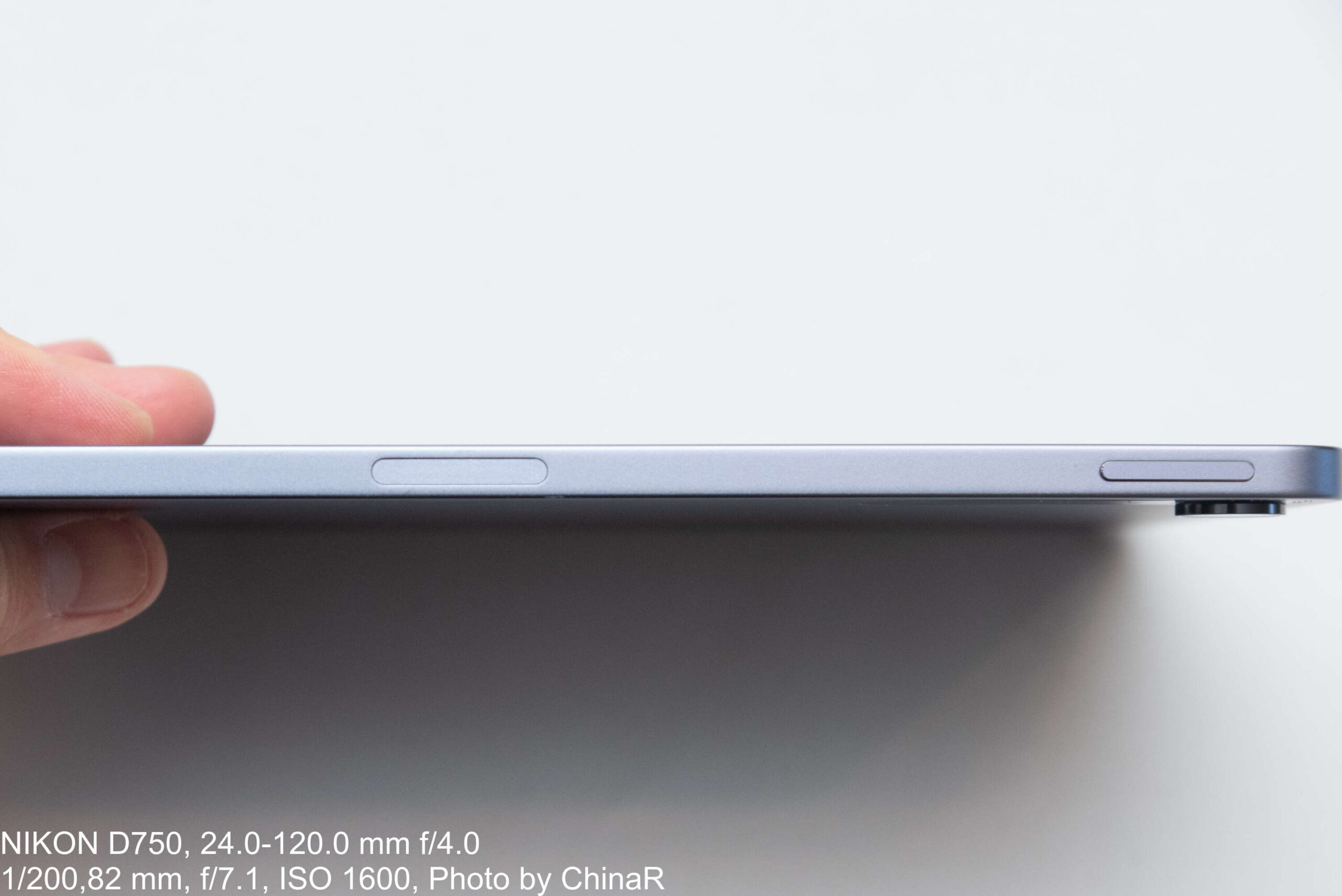 本体の厚みはわずか6.46mm。この薄さは持ち運び時の携帯性を大きく向上させています。側面部についても確認していきます。電源ボタンは横向き使用時の左側上部に配置され、ボリュームキーは上側の長辺左端に配置。一般的なAndroidタブレットと同様の配置で、違和感なく操作できます。
