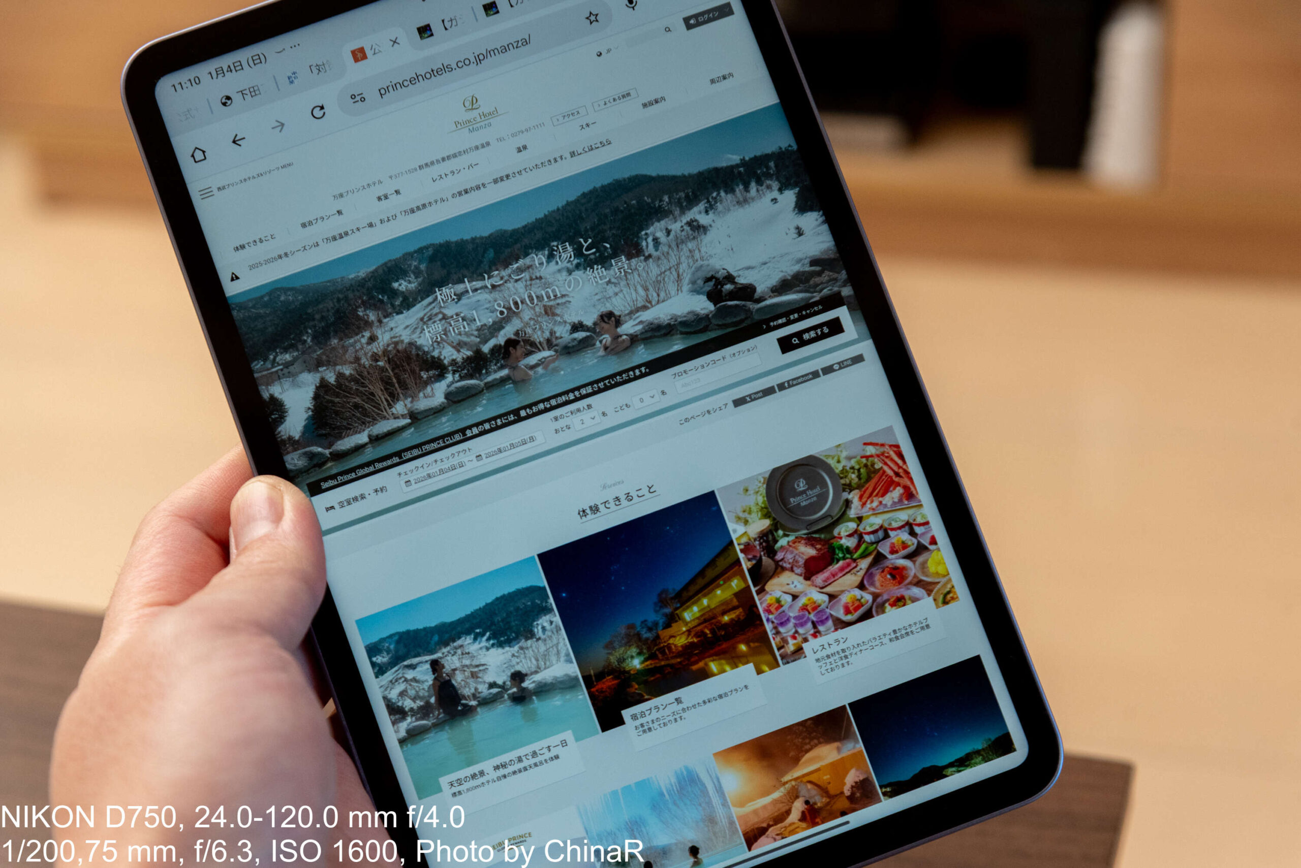 下田プリンスホテルに行った際、友人の様子や外の海を撮影してみましたが、タブレットのカメラとしては十分綺麗に撮れる印象です。ただし、初戦はタブレットのカメラということもあり、コントラストは低めで、外の景色を撮影すると黒が潰れ気味になってしまいます。手ぶれ補正も搭載していないため、ちょっとしたドキュメントを撮影する程度には良いかな、という感じです。
